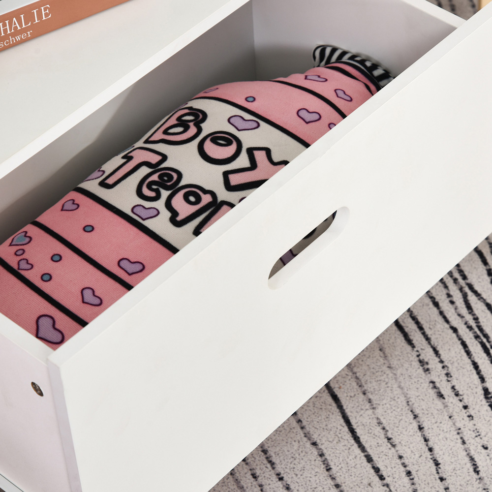 Teach your little one the correct way to organise with this Playful Haven Blue Kids Bookshelf. Crafted into a rocket-inspired shape, the MDF frame holds three shelves and a big slide-out drawer, giving them plenty of storage and holding room for books, toys, ornaments and games. Sturdy, the four stumpy wooden legs give balance to the frame, and the natural finished wood complements the bright white of the main structure. Smooth to the touch, this unit is easy to clean - perfect for riding those mysterious stains every now and again.