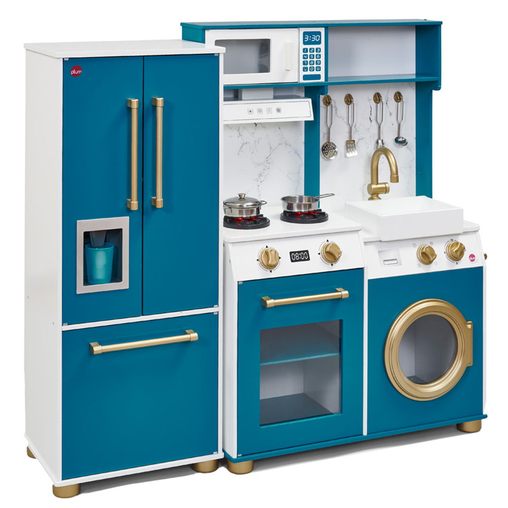 Spark a passion for cooking and food with the Plum Play Bakehouse Traditional Wooden Oxford Blue Kitchen with Fridge. This realistic kitchen setup will complement and brighten your home with its Oxford blue exterior, brass accents and imitation marbled backsplash. You can light up hobs with sound, cooker hood, and microwave oven. The sturdy Belfast sink, with a copper colour turning tap handle, is perfect for washing up all those leftover plates. Children can also set the temperature of the oven with the click-and-turn knobs. The open and closed cabinet doors will help children mimic the daily wash of dirty socks and shirts. It also has an ice dispenser with plastic ice cubes and cups. The modular fridge freezer with an internal shelf has plenty of room for groceries. Furthermore, it has a stylish assortment of stainless-steel kitchen utensils, pots and pans, hooks, and towel rails.