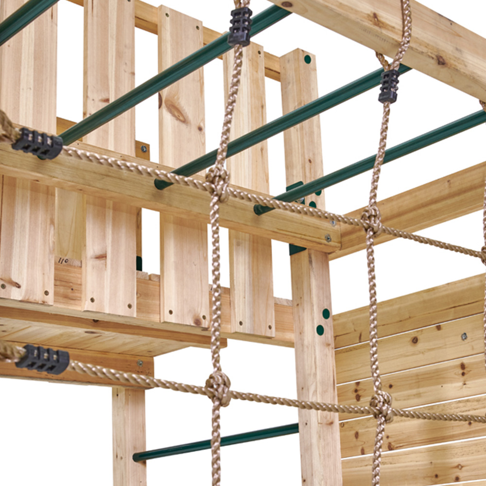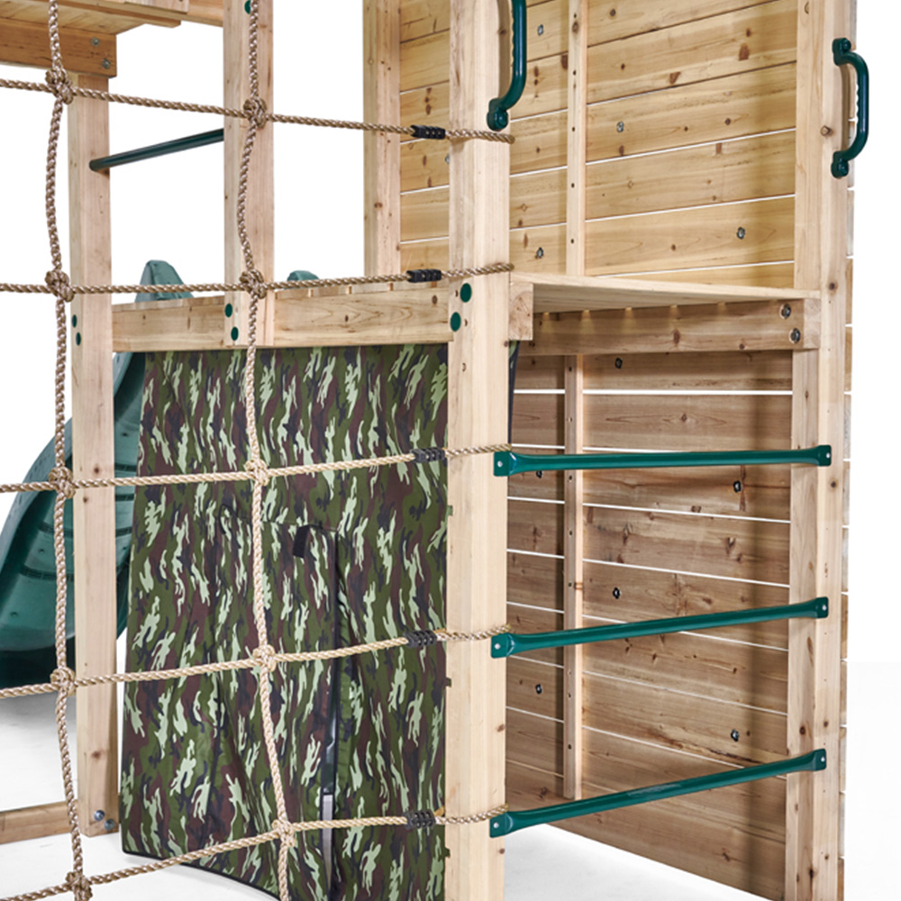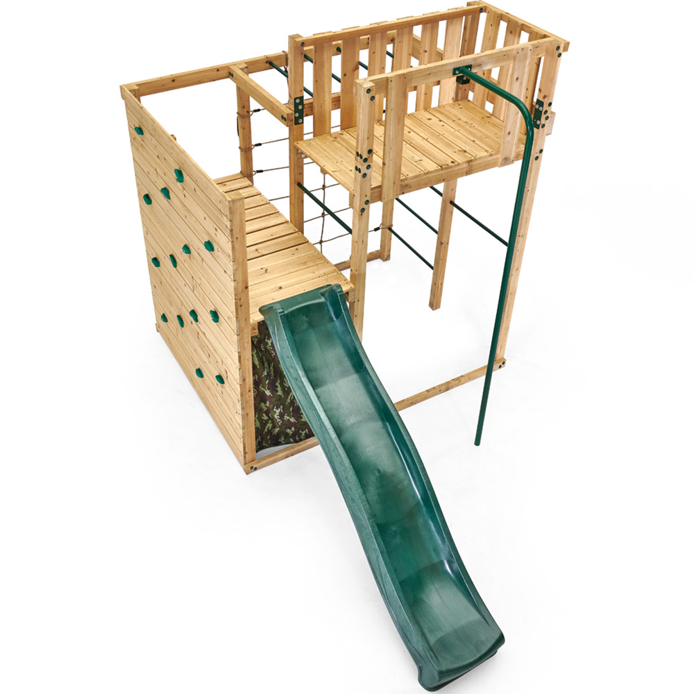 Encourage outdoor play with the Plum Play Climbing Cube Wooden Playcentre XL, offering action-packed activities and 360-degree garden play. It provides an ideal play space for climbing, swinging, sliding, and hiding, making it great for keeping kids entertained and helping them develop confidence through physical play. The camouflage fabric den is perfect for imaginative role play and creates a large secret play area for secret missions or as a kiddies’ HQ. The wooden crow’s nest lookout with a 2.5m fireman’s pole adds an extra fun element to the set. Climbing features include a wooden platform with an 8ft wave slide, ladder, monkey bars, and trapeze with metal rungs for swinging and hanging, as well as a rock wall with hand and foot grips and a cargo net. Made from sustainably sourced FSC-certified wood, this climbing cube is strong, sturdy, and built to last for years to come. It's naturally resistant to wood rot and insect infestation, and the clear stain prevents wood discolouration for up to 12 months. Parents can have peace of mind knowing that safety is a top priority in the design of this set.