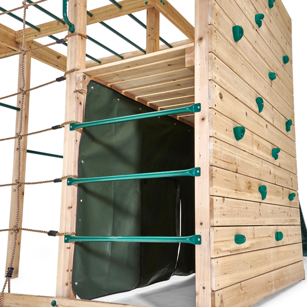 Encourage outdoor play with the Plum Play Climbing Cube Wooden Playcentre, offering action-packed activities and 360-degree garden play. It includes numerous climbing areas such as ladders, trapezes, and a slide for climbing, swinging, sliding, and hiding. The camouflage fabric side panels create a large secret play den area, making it great for rendezvous points on secret missions or as kiddies’ HQ. The playcentre is ideal for imaginative role-play games and will help children burn off energy in a fun environment. It features a climbing platform with an 8ft wave slide, ladder, monkey bars, and trapeze with metal rungs for swinging and hanging. Additionally, it has a rock wall with hand and foot grips and a cargo net. Made from sustainably sourced FSC-certified wood, this climbing cube is strong, sturdy, and built to last for years to come. It's naturally resistant to wood rot and insect infestation, and the clear stain prevents wood discolouration for up to 12 months. Parents can be assured that safety comes first in the design of this set.