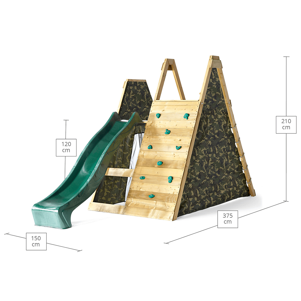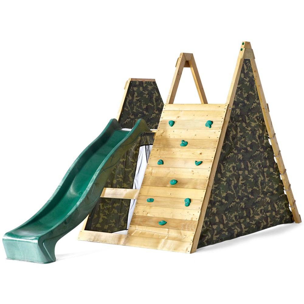 Encourage outdoor play with the Plum Play Climbing Pyramid Wooden Playcentre. The set provides children with hours of outdoor fun and games. Featuring a large double play deck with a cargo net, ladder, rock wall with coloured hand and foot grips, and an 8ft wave slide, kids will be entertained for hours. The camouflage fabric side panels create a large secret play den area inside the pyramid, perfect for imaginative role-play games. Made from premium FSC-certified sustainably sourced wood, it is naturally resistant to wood rot and insect damage, ensuring safety and quality play.