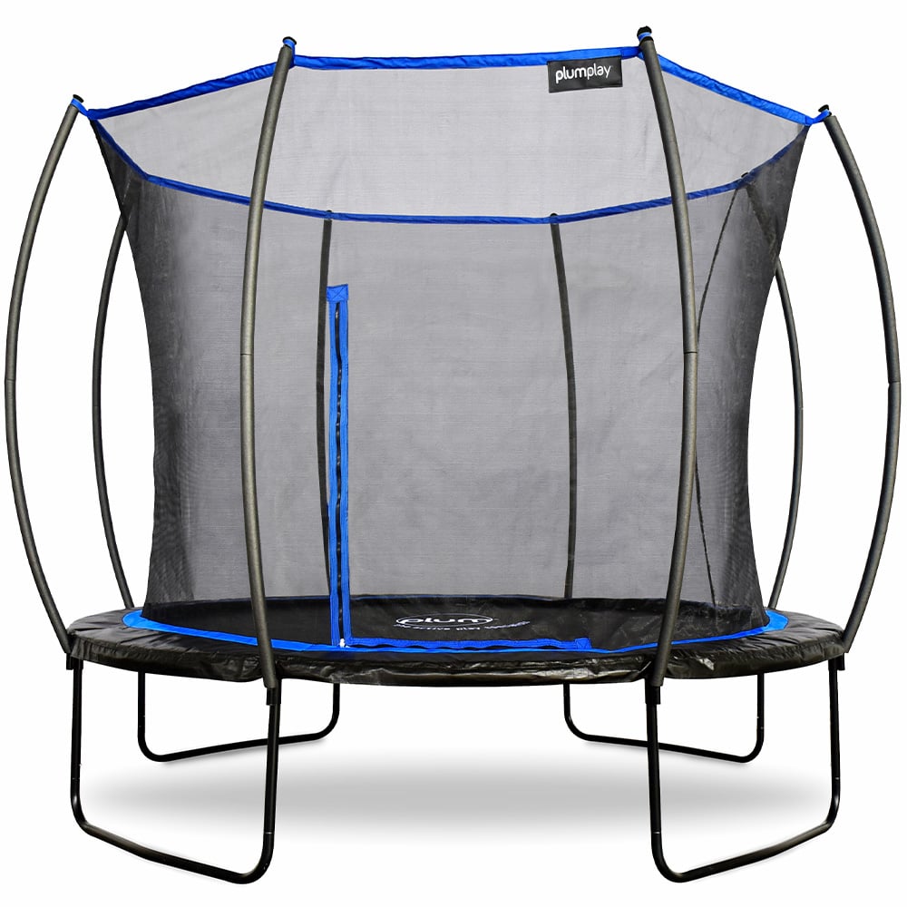 Elevate outdoor play with the Plum Play Deluxe Springsafe 10ft Trampoline with Safety Enclosure Net. The patented Springsafe technology offers ultimate protection by keeping users clear of springs and frame parts that could potentially cause injury. The 2G enclosure boasts an extra-large zipped entry, ensuring easy access and maximum safety. Crafted from weatherproof materials, the safety pad and enclosure foam guarantee durability. The galvanised steel frame and black powder-coated legs provide rust protection, ensuring years of use without compromising style. The unique enclosure cap allows for the effortless addition of various accessories, such as shoe bags for convenient storage, sunshades for summer coolness, tents for imaginative hideaways, gentle mists and water jets for instant water play fun, mini basketball sets, covers for protection, ladders, and ground anchors for safety. Grow and adapt your trampoline to match your child's development, creating an extraordinary play-scape that ignites joy and imagination.