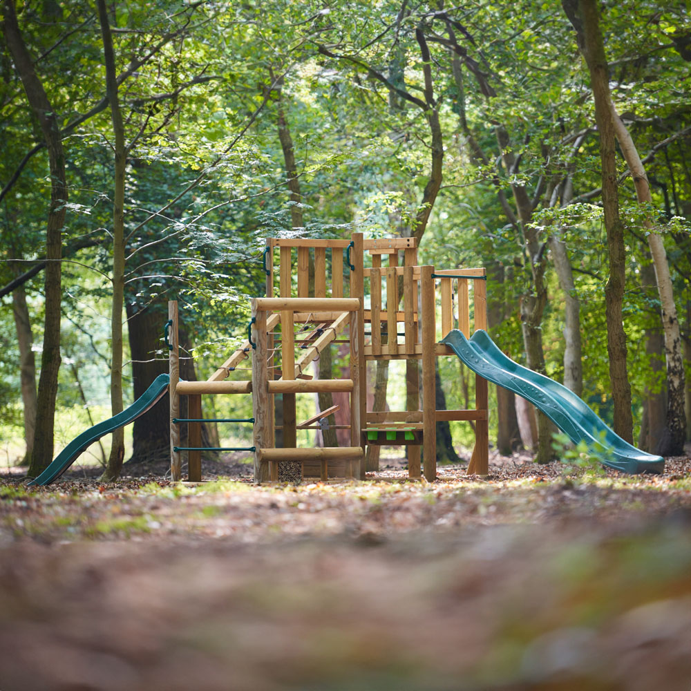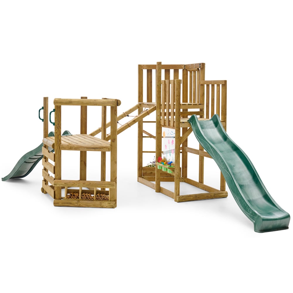 Encourage outdoor play with the Plum Play Discovery Adventure Playcentre. The centre offers children the opportunity to embark on an exciting woodland journey right in their backyard. Crafted from sustainably sourced FSC-certified timber, this centre seamlessly integrates nature-inspired activities with educational play. Suitable for children from three years and up, this captivating climbing frame blends STEAM-based learning opportunities with engaging physical play features. Novice adventurers can ascend to the half-hexagon wooden play deck using the ladder equipped with sturdy metal rungs. From there, they can experience the thrill of a 6ft wave slide, perfect for young explorers seeking excitement. Meanwhile, more experienced adventurers can conquer the two-level treetop play deck with an impressive 8ft wave slide, ideal for those eager to take their exploration to new heights. A cargo climbing bridge provides a thrilling ascent, and easy-grip handles ensure stability throughout playtime. Featuring a bamboo water run complete with adjustable chutes that nurture a potted planter, children can delve into the world of gardening and develop an appreciation for growing their fruits and veggies, thanks to the inclusion of mini gardening tools. Additionally, a bug hotel with a bamboo starter kit offers a charming sanctuary for insects, complementing the play centre's connection to nature. For hands-on creativity, an easy clean acrylic painting screen equipped with paint pots and paint pens inspires budding artists to engage in fun and messy finger painting activities. A forager den nestled beneath the play decks provides a peaceful retreat where children can unwind, read, and marvel at the treasures they've collected during their woodland adventures.
