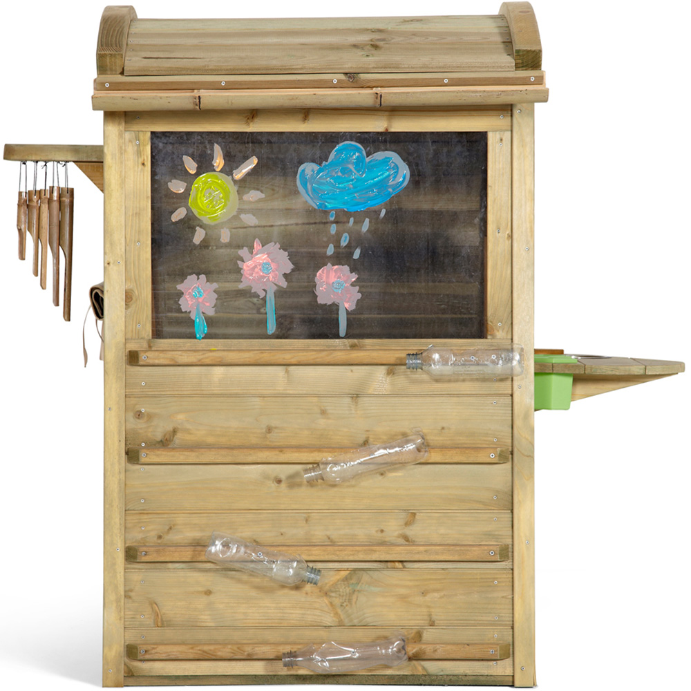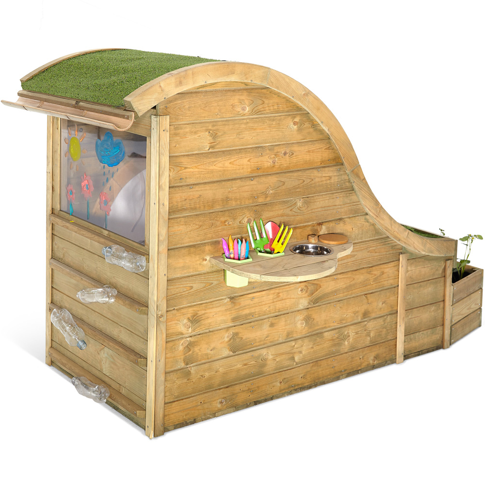 Transport your children into a world of outdoor adventure with the Plum Play Discovery Nature Play Hideaway. Crafted from sustainably sourced FSC-certified timber, this enchanting hideaway offers 360° play opportunities, ensuring that little nature enthusiasts are fully immersed in imaginative and active play. The hideaway's thoughtfully designed features include a turf-ready roof, allowing for the addition of real or artificial turf to blend seamlessly with the surrounding landscape. Whether nestled in an urban garden or a countryside retreat, the hideaway brings a touch of rustic charm to any outdoor space. Young explorers can amplify their creativity in the mud kitchen, complete with a sink, tinker pots, hob, and an array of accessories for collecting woodland treasures and whipping up delightful mud pies. The easy-clean painting screen, accompanied by paintbrush pens, encourages artistic expression, with the added convenience of being effortlessly washed for endless creativity. Storage pots are provided for stashing garden trinkets, while the bamboo wind chimes offer a delightful sensory experience. Additionally, children can delight in posting letters to friends using the swinging mini letterbox. Perfect for budding gardeners, the hideaway features a built-in planter, creating a mini eco centre to nurture plants and explore the wonders of nature. Embracing eco-friendly design, this hideaway ingeniously recycles water by directing it down the roof and into the planter. Alternatively, water can be collected in the bamboo gutter and diverted to a bucket or custom water run, promoting a sustainable approach to outdoor play.