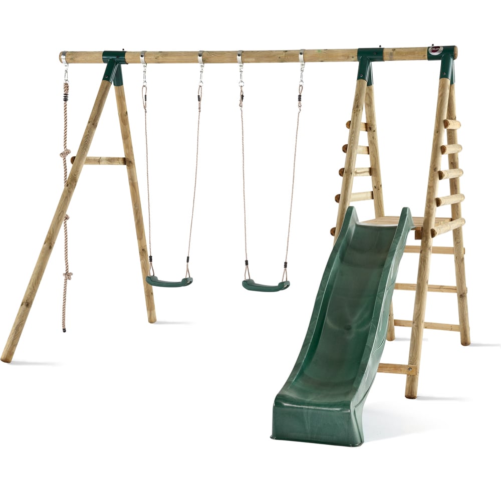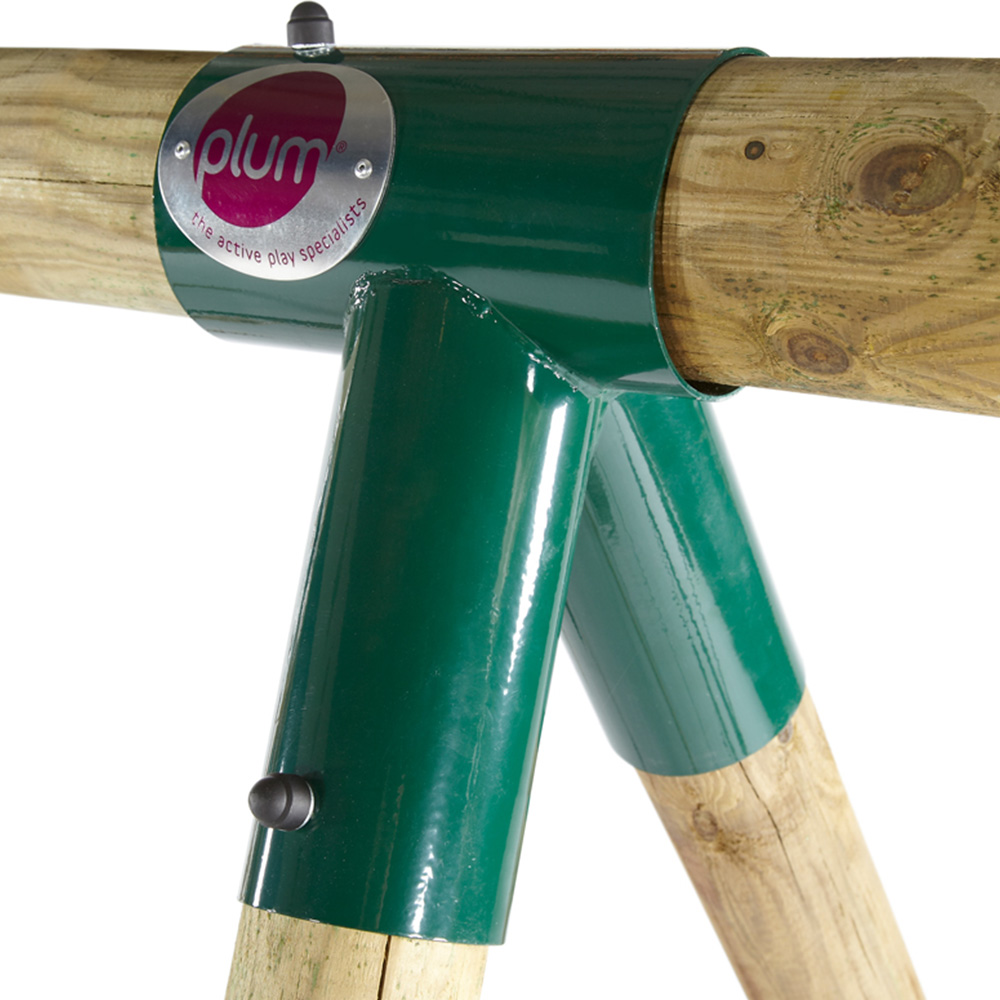 Add more fun to your child's playtime with Plum Play Giant Baboon Wooden Swing Set. Multi features means endless hours of outdoor play with this swing set. This amazing swing set features a soft feel climbing rope, 2 swings, 4ft high play deck and 8ft wave slide; providing plenty of space for active and agile play. The swing set uses soft feel ropes and heavy duty blow moulded seats for extra durability. The round pole premium FSC certified sustainably sourced wood is pressure treated for extra strength. The swing set top bar is 100mm in diameter and the legs are 80mm in diameter making the frame highly robust. Metal swing attachments encircle the pole so no drilling is required, maintaining the strength and integrity of the timber. The sturdy frame also has wooden cross braces giving the swing extra stability. Parents can therefore have peace of mind their children are riding a high quality swing set, with safety standards at the centre of its design.