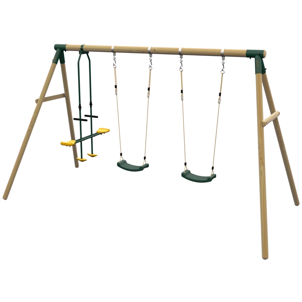 This fabulous swing set is for year-round outdoor play. Children and their friends can have hours of energetic play as they share the glider and swings. This wooden swing set from Plum offers a two-seat glider and double swings, which use soft feel ropes and heavy-duty blow-moulded seats for extra durability. The round pole is premium FSC-certified sustainably sourced wood, is pressure-treated for extra strength. The swing set top bar is 90mm in diameter, and the legs are 70mm in diameter, making the frame highly robust. Metal swing attachments encircle the pole so no drilling is required, maintaining the strength and integrity of the timber. The sturdy frame also has wooden cross braces, giving the swing extra stability. Parents can have peace of mind that their children are riding a high-quality swing set, with safety standards at the centre of its design.