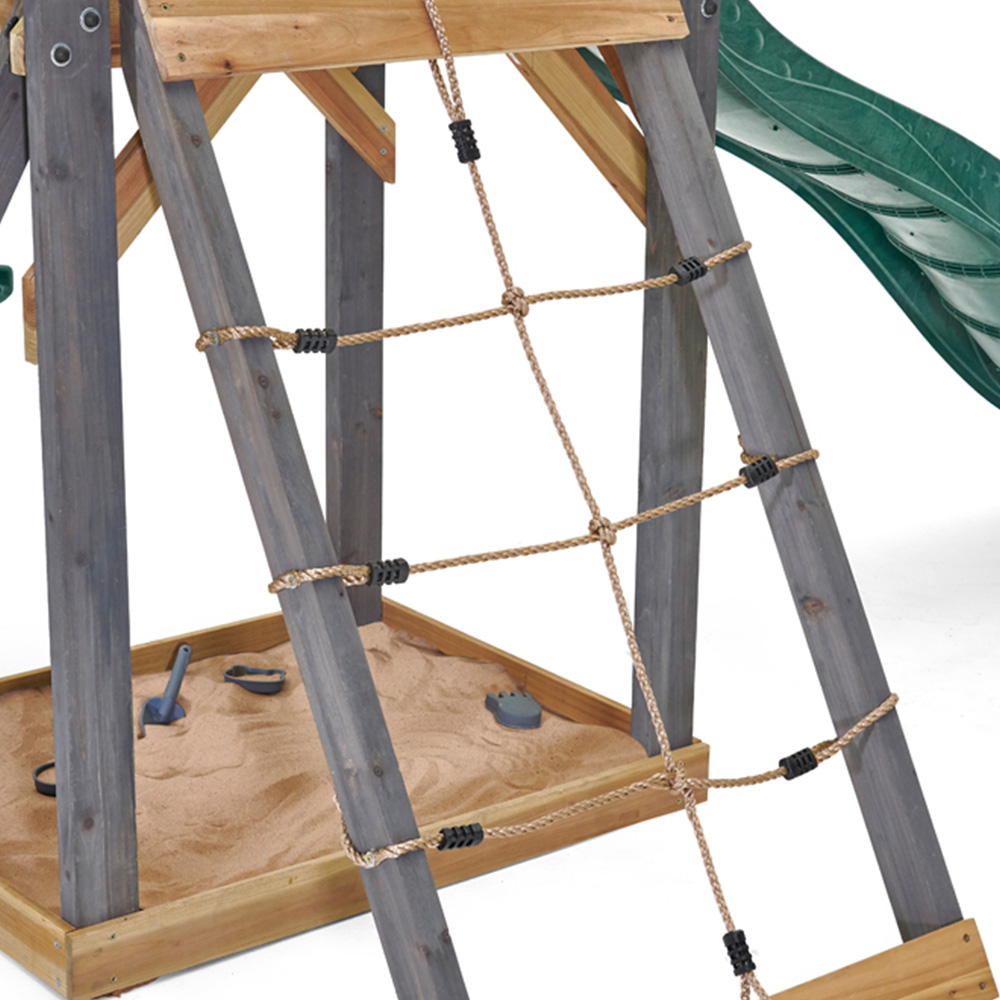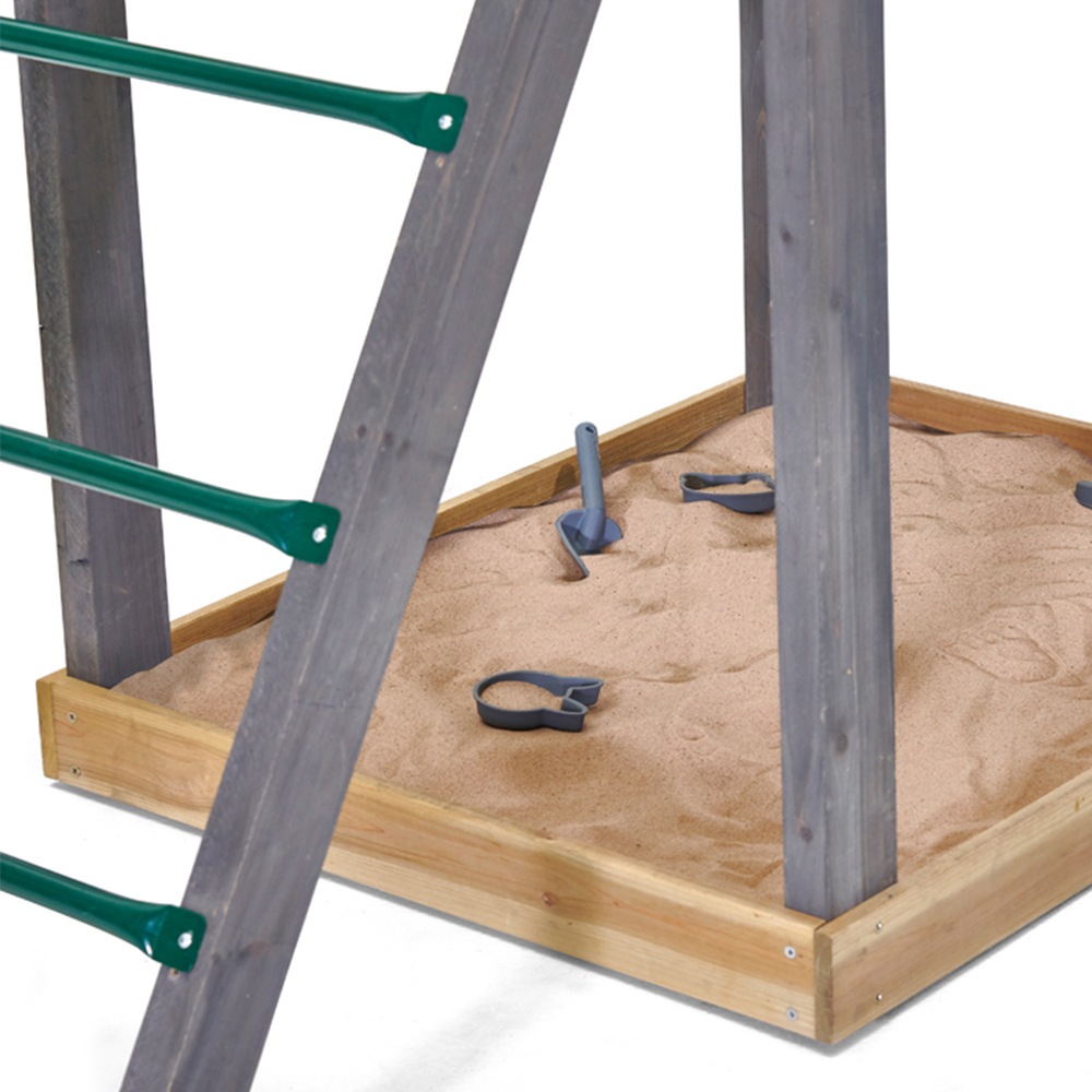 Add more fun to your child's playtime with Plum Play Siamang Wooden Playcentre. This is a climbing frame packed full of features for action-packed play. Climbing play equipment includes a climbing ladder with metal rungs and a cargo net climber that leads to a wooden play deck with an 8ft wave slide. A UV-resistant fabric sunshade sail, in a vibrant lime green, will help to protect children from the sun whilst they play. The platform has a fabric chalkboard for creative drawing, whilst a square sandpit sits at the base of the play centre, designed to keep children entertained and engaged in sensory play activities. The sandpit includes a fabric liner to protect the sand from soil and debris and allows water to drain. The climbing frame is complete with two single swings with adjustable height ropes, allowing children to swing and play together. Made from sustainably sourced FSC-certified timber: stylish stained wood comes in charcoal grey and a light oak finish, so there is no need to treat your wood for at least 12 months. Parents can have peace of mind as it comes with a safety-first design. The durable frame includes powder-coated steel corner brackets and wooden cross beams for stability. Ground anchors are included to secure your play centre into the ground.