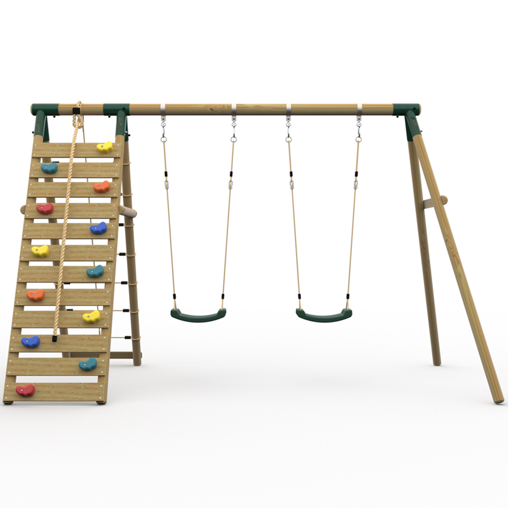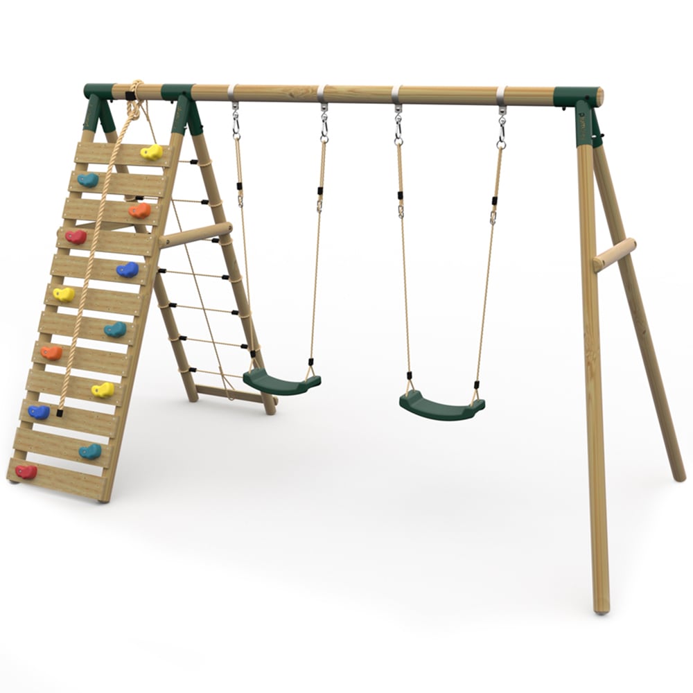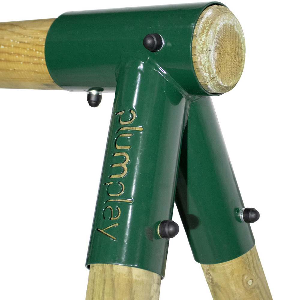 The amazing Plum Play Uakari Green Wooden Double Swing and Climbing Wall Set is perfect for agile and active outdoor play. This fantastic garden swing set features double swings, a rock wall with coloured hand and foot grips and a soft feel cargo net. The wooden swing set provides plenty of space to socialise and play with friends. The play set uses soft-feel ropes and heavy-duty blow-moulded seats for extra durability. The round pole, premium FSC-certified sustainably sourced wood, is pressure-treated and is extremely strong. The top bar is 90mm in diameter, and the legs are 70mm in diameter, making the swing set frame highly robust. Metal swing attachments encircle the pole so no drilling is required, maintaining the strength and integrity of the timber. The sturdy frame also has wooden cross braces, giving the swing extra stability. Parents can therefore have peace of mind that their children are riding a high-quality swing set with safety standards at the centre of its design.