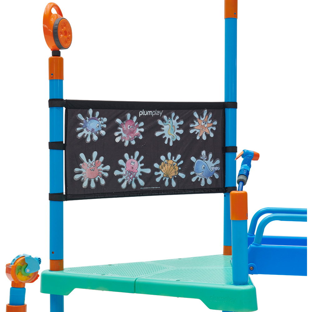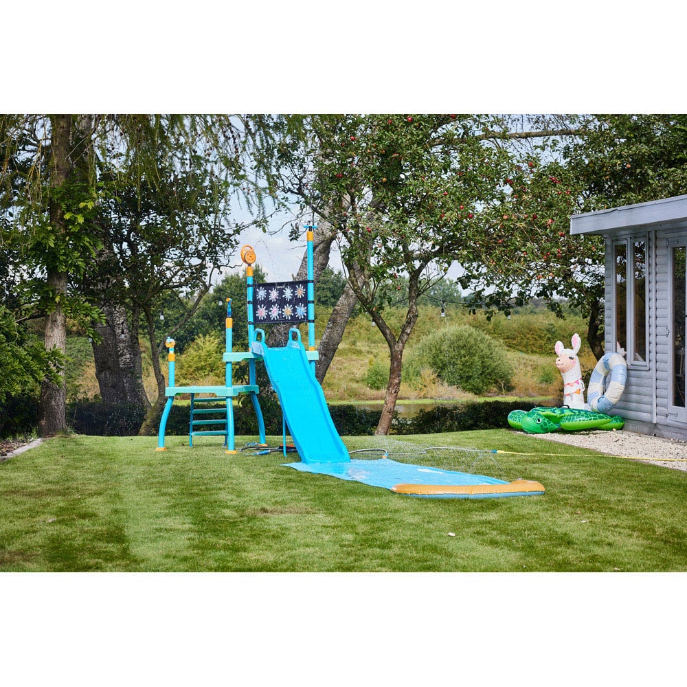 Enjoy your water park experience at home with the Plum Play Water Park Shower Tower. This water play centre has four accessories promoting healthy active play while helping children develop their motor skills and coordination. The water blaster is ideal for water fights with friends or practising aim. The eight-pattern and three-arm sprinkler helps to keep kids cool during hot sunny days, whilst the bubble blower adds to the sensory play. Kids can have even more fun with the water-reveal colouring wall. Also, your little ones can learn to recognise their favourite sea creatures by aiming the water blaster at the wall to reveal the underwater animals. The colouring fence can also be used with a paintbrush and water pot when it’s time to turn off the hose. The six-foot slide along the three-meter water chute is completed with sprinklers to ensure total soaking. The pool sprinklers make it even more for your child. This centre is ideal for wet and dry play, bringing endless year-round fun to your garden. It includes a four-way hose connector, a slip-resistant play platform and steps. The steel frame is powder-coated in colour and galvanised for ultimate protection against rust.
