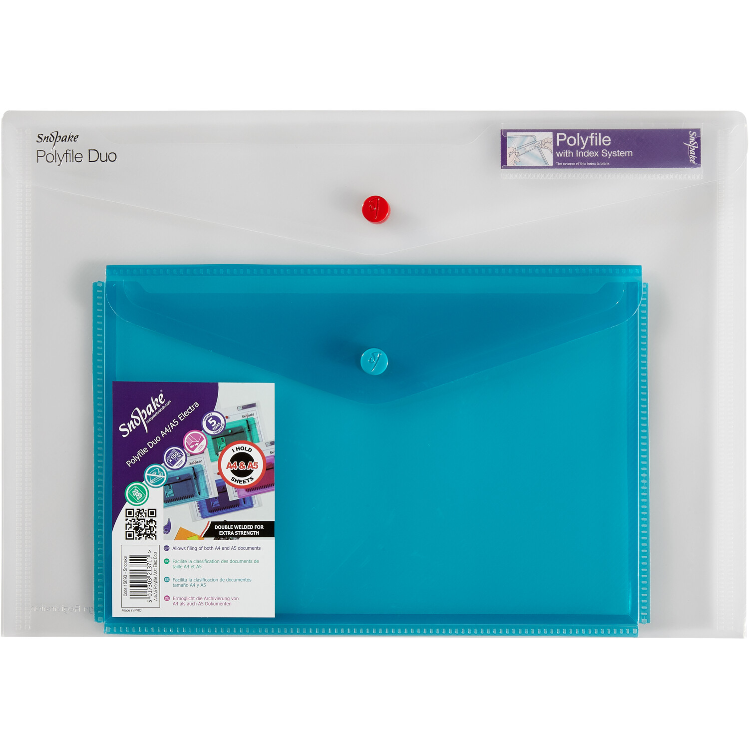 This Polyfile Duo A4 Electra has two sections for storing documents, notes, pens and paper. Holds up to 150 A4 sheets and 70 A5 sheets. Press-stud closure keeps contents safe and secure. Includes index tabs for labelling and personalisation.