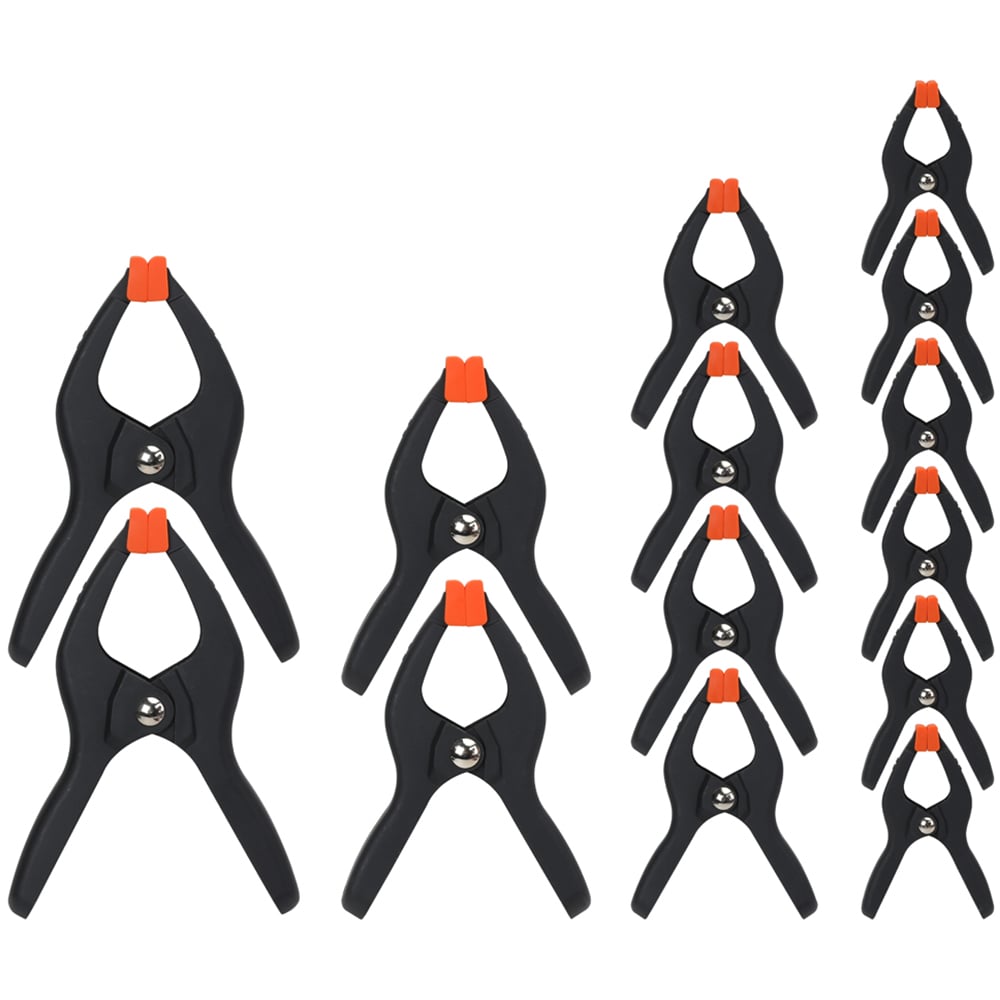 Pony's 14-piece plastic spring clamp set has something for any job requiring frequent clamping and unclamping. These lightweight clamps pack a clamping force of up to 50 pounds, and they feature protective pivoting jaw pads to ensure a tight hold on your projects without causing damage. Contains: 6 x 3/4" clamps (1 1/4" reach), 4 x 1" clamps (1 3/4" reach), 2 x 2" clamps (2 1/4" reach), 2 x 3" clamps (2 3/4" reach).