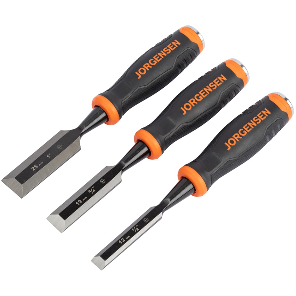 Jorgensen's 3 piece woodworking chisel set features carbon steel blades for strength and durability to tackle any woodworking project. These blades are hardened and tempered for edge retention and resharpening, and lacquered to protect against corrosion. The lightweight, ergonomic handle is designed for comfort and precision, a must-have for any professional and DIYer.