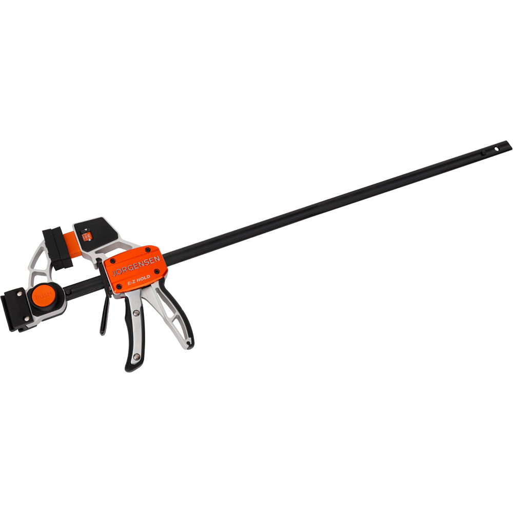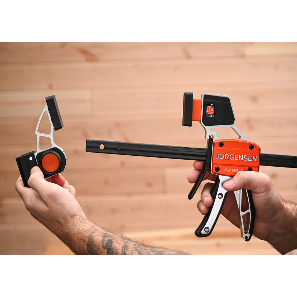 Reach for the Jorgensen E-Z Hold Platinum Series Trigger Clamp for industrial and professional applications. The durable aluminium body withstands tremendous clamping pressure and is designed with a clamping force indicator that helps quickly identify the desired clamping force. The exclusive patented feature lets you join two clamps to create a more oversized clamp with more than double the opening capacity of a single clamp. Other features include easy/comfortable one-handed clamping, 3 1/8" jaw reach with protective pads, quick release lever, ergonomically contoured comfort grip, and can easily be converted to spreader clamps.