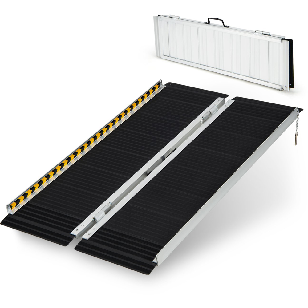 Enhance accessibility with ease using the Costway Portable Aluminium Wheelchair Ramp with Transition Plate 4ft. This ramp offers a seamless blend of functionality and safety, featuring a transition plate and a non-slip surface that securely fits the ground, ensuring maximum stability and reducing the risk of slips and falls. It's designed with convenience in mind, allowing for easy folding into a compact size, making it perfect for space-saving storage and effortless portability. The durable aluminium frame is not only robust and rustproof but also lightweight, facilitating easy transportation while providing solid support. Suitable for a broad range of uses, from wheelchairs and strollers to trolleys, this ramp ensures safe and stable access for all. Reflective warning stickers enhance visibility, further ensuring safety by minimising fall risks, while safety pins and stable hinges enhance its durability.