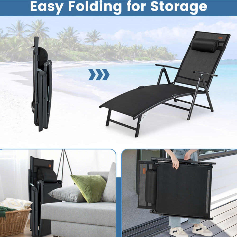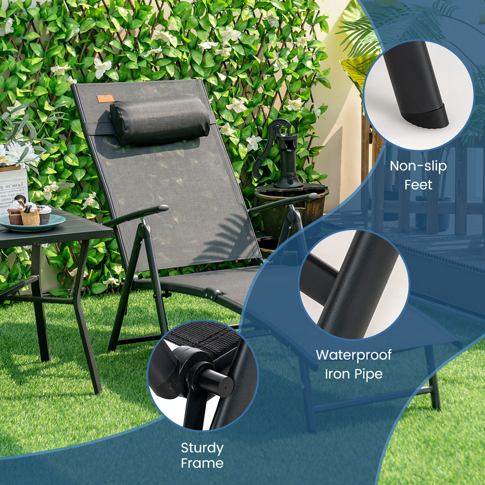 Elevate your outdoor relaxation with the Costway Black Portable Reclining Chair. It is crafted to enhance your leisure time with its seven adjustable backrest positions. Whether you're in the mood to read, relax, or take a nap, this chair adjusts from 96 degrees to 145 degrees to meet your needs. The breathable fabric and ergonomic design, including a soft headrest and rounded handrails, ensure a comfortable experience. Its sturdy metal frame supports up to 150kg, and the non-slip feet add stability for worry-free lounging. Plus, the chair's easy folding mechanism allows for compact storage and effortless transport, making it an ideal choice for any outdoor setting.