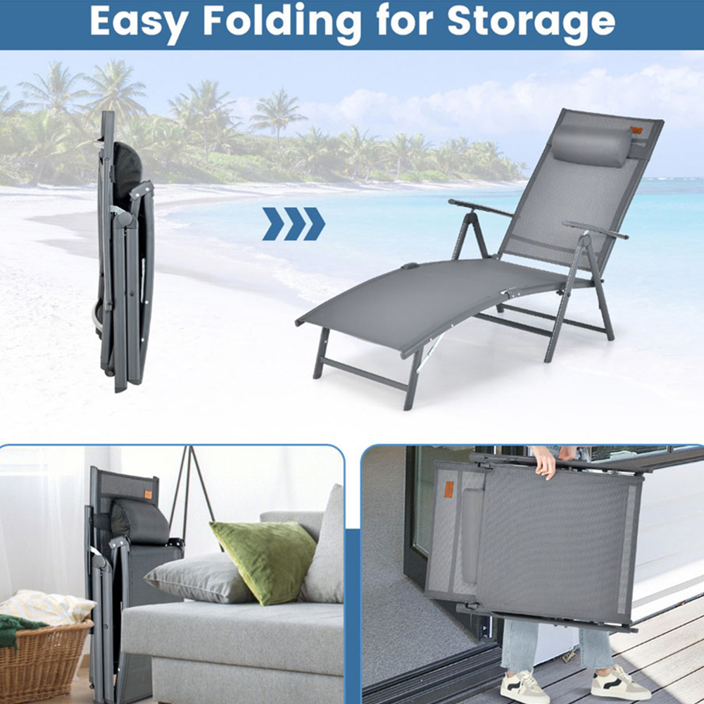 Elevate your outdoor relaxation with the Costway Grey Portable Reclining Chair. It is crafted to enhance your leisure time with its seven adjustable backrest positions. Whether you're in the mood to read, relax, or take a nap, this chair adjusts from 96 degrees to 145 degrees to meet your needs. The breathable fabric and ergonomic design, including a soft headrest and rounded handrails, ensure a comfortable experience. Its sturdy metal frame supports up to 150kg, and the non-slip feet add stability for worry-free lounging. Plus, the chair's easy folding mechanism allows for compact storage and effortless transport, making it an ideal choice for any outdoor setting.