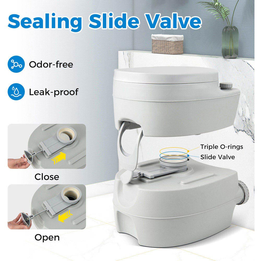 Enjoy a convenient and hassle-free solution for all your bathroom needs with the Costway Grey Portable Toilet with Detachable Waste Tank 20L. Whether you're camping, boating, fishing, or in need of a portable facility for hospital or home nursing purposes, this versatile toilet is the perfect companion. Equipped with a convenient cleaning system, the camping toilet features a handle flush pump for quick waste disposal and an advanced triple-sealing slide valve to prevent odours and leakage. Its convenient handles make relocation effortless, allowing you to easily maintain your desired setup. With a 12L clean water tank and a 20L sewage water tank, the portable toilet allows for up to 150-180 rinses on long-distance trips. You'll no longer have to constantly refill the tanks, giving you a worry-free lavatory experience. The built-in pump provides a powerful clean flush without the need for plumbing or external connections, and the T-type water outlet ensures thorough flushing with no residue left behind. The RV toilet is designed to be odour-free and features a humanised design for a more comfortable experience. When the sewage tank is full, simply detach the upper tank from the lower sewage tank for quick and easy emptying. Both the clean water tank and waste water tank come with handles for easy transportation, making it perfect for outdoor activities, as well as home or hospital nursing needs.