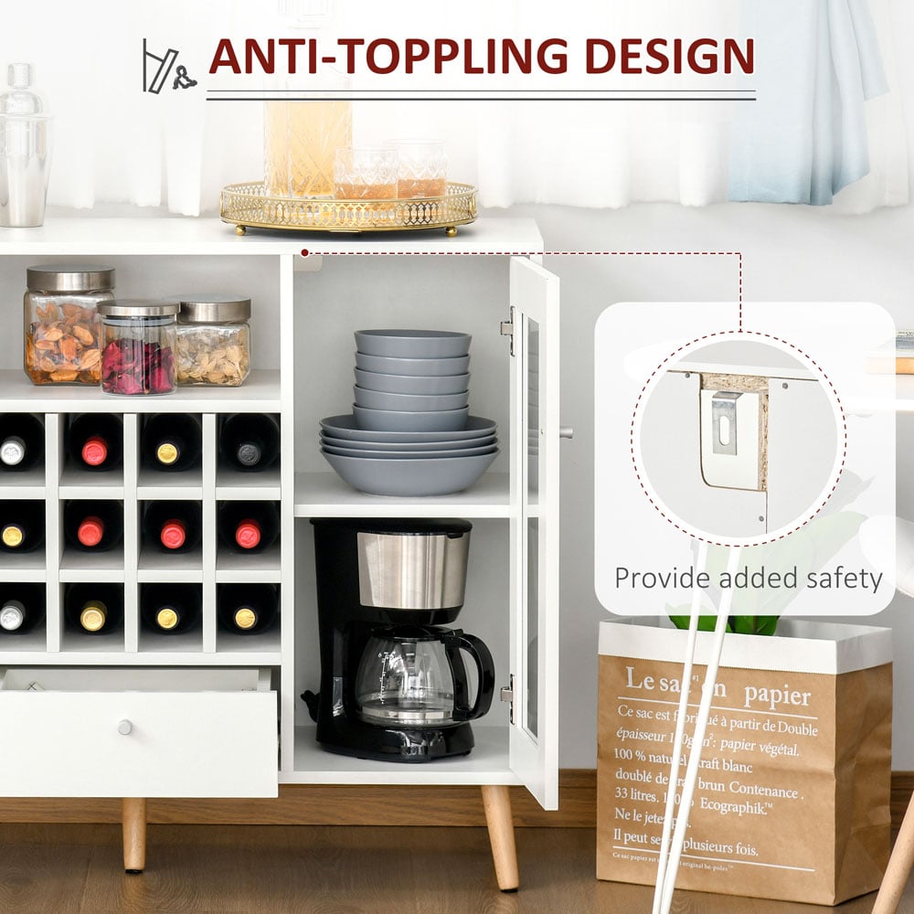 Elevate the decor of your living room with the sleek and modern Portland White Sideboard Storage Cabinet. The bar cabinet consists of two side cupboards, 12 wine bottle racks, a drawer and a shelf, great for placing in the kitchen and dining areas. The cabinet has a glass door. A sleek look allows you to see inside easily and keeps all items inside clean, preventing dirt and dust from gathering. Handle to open easily. Practise board structure makes this a durable piece, suitable for everyday use. Holds all bottles and glasses safely, with five wooden legs to keep it balanced.