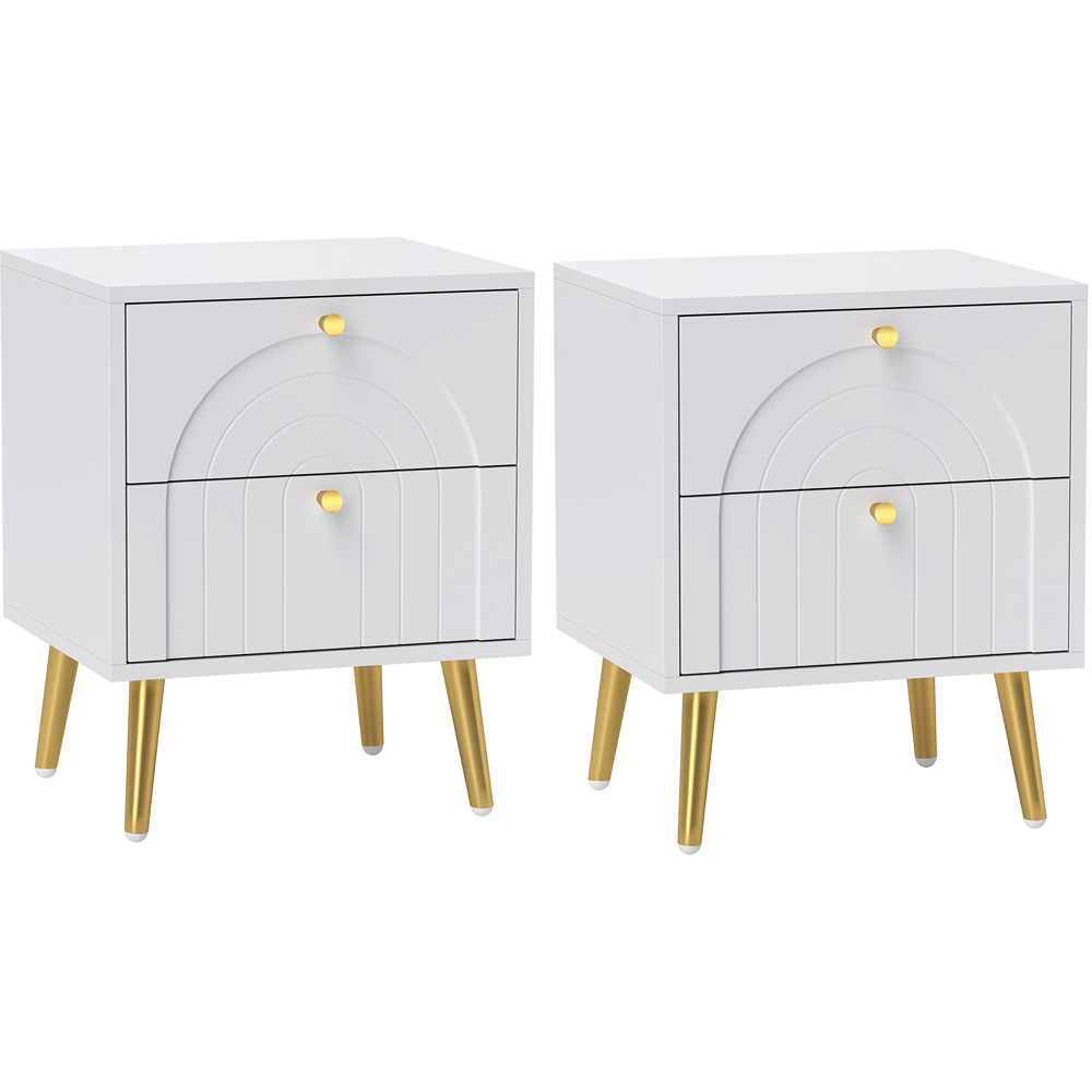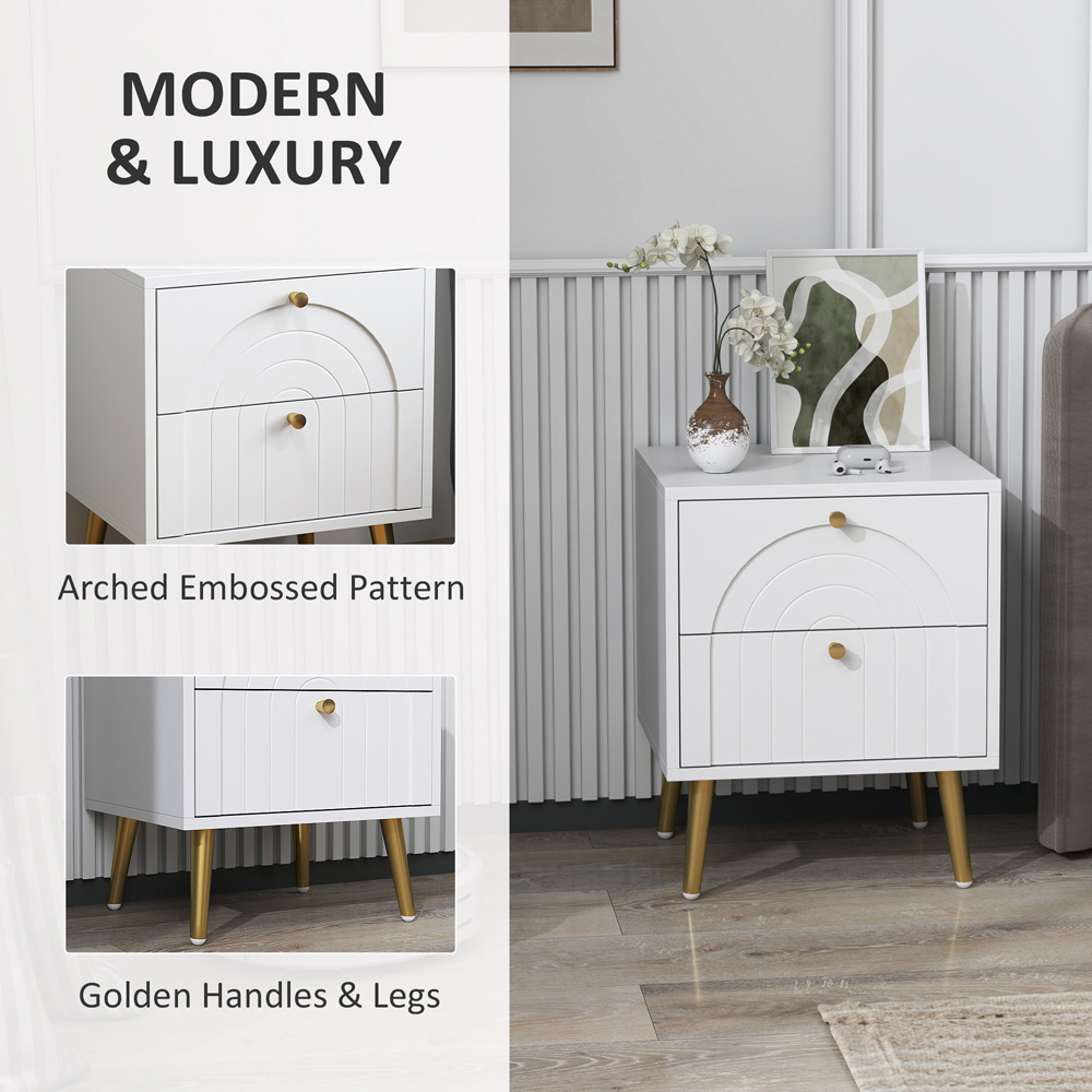 Transform your bedroom with the HOMCOM nightstand, a charming duo that doubles as stylish side tables. Each white bedside table features two spacious drawers adorned with an arched embossed pattern, complemented by gold-tone pulls and legs. The flat tabletops offer additional space for your night-time essentials, making these small bedside tables as functional as they are elegant.