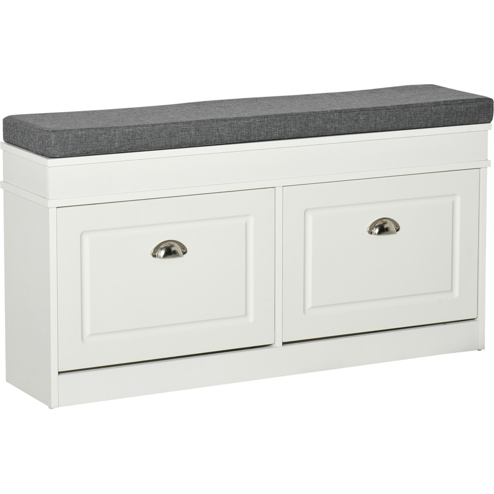 Say goodbye to unnecessary clutter in the hallway and beyond with this Portland 2-Drawer White Shoe Storage Bench with a Seat. This unit comes with two drawers for organisation - each can hold a standard four pairs of shoes. Moreover, there is an adjustable shelf in both drawers if you need to rearrange the storage size. Made from a blend of particle board and MDF, this piece is tough and sturdy. Plus, it's finished with a cushioned top so you can sit down comfortably. The storage bench makes a suitable option for hallways, living space entrances and bedrooms. Ensuring safety, it comes with anti-tipping straps for pet and child safety. Note: Maximum shoe size is UK 8.