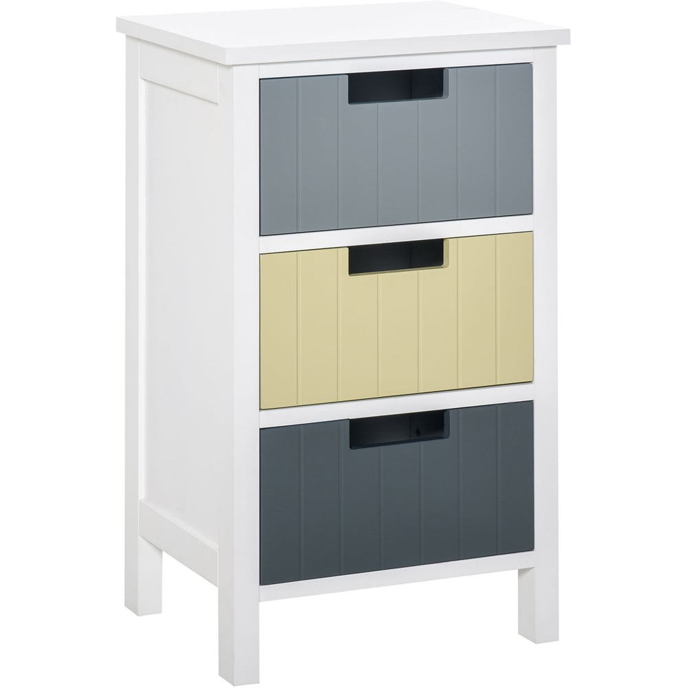 Add a pop of colour to your home with the Portland 3-drawer white and grey Storage Unit. This bedroom chest of drawers from features drawers in various gentle shades, adding a subtle touch of colour to your room. Crafted from sturdy MDF, this storage unit is built to last and includes a water-resistant surface for added durability. With four long legs and a spacious tabletop, this unit offers ample storage space. Elevate your home decor this season with this stylish and functional storage solution.