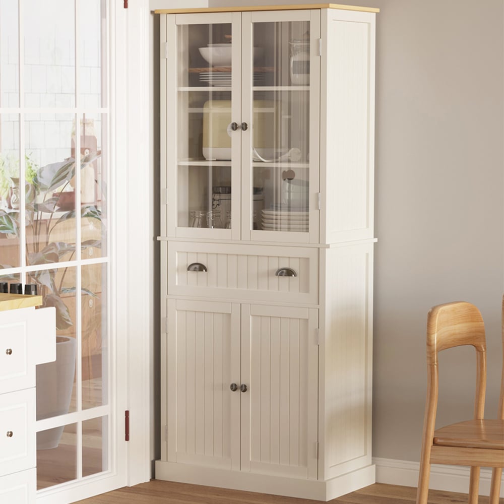 Upgrade your space with a stylish and practical Portland Cream White 4 Door Single Drawer Kitchen Cabinet. This kitchen storage unit can help bring your kitchen from cluttered to organized in no time. The 5-tier shelving of this storage organizer gives you plenty of room for dishes, cookbooks, pots and pants, dry goods or plastic containers while the central drawer allow you to put away napkins, towels and silverware. Keep organized behind the four doors, so your items stay safe and dust-free. If you have taller items, the adjustable shelves can be customized to fit items like pitchers, pasta containers and blenders. No more stacking pots and pans on top of each other and now you have to move them all to get to that soup pot in the back, this pantry storage cabinet will give you the space to know where everything is, and get to it easily.