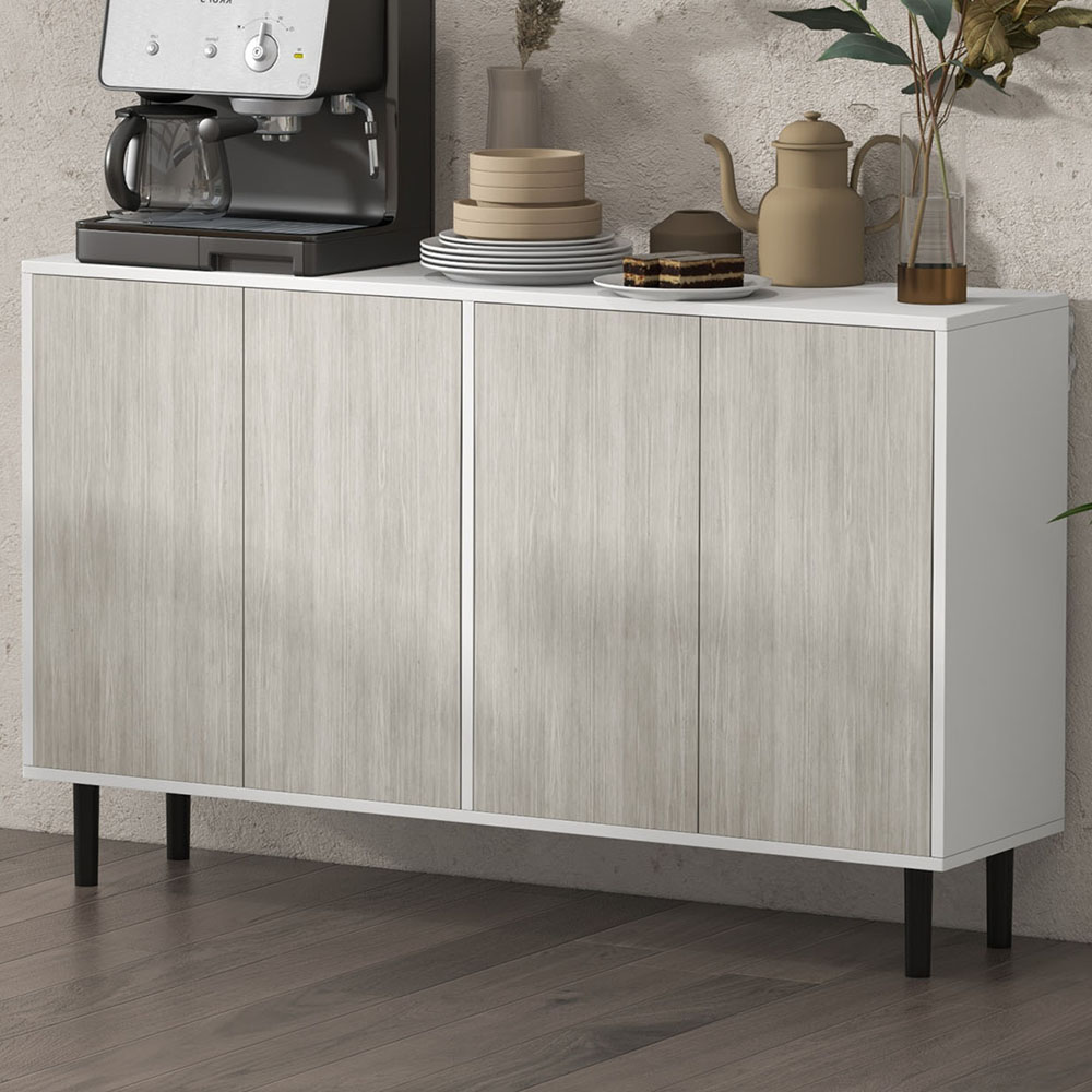 Keep your home tidy and organised with this Portland 4-door White Kitchen Sideboard. This sideboard features four doors that open to reveal a middle shelf in the two compartments, creating four individual areas, making it great for organising crockery, boxes and more. The flat table top is ideal for your favourite pieces, in full display. Show off photos, trinkets and more. The push-open doors add a handy finishing touch. It has pine wood legs. This simple and stylish storage cupboard will look great wherever you place it.