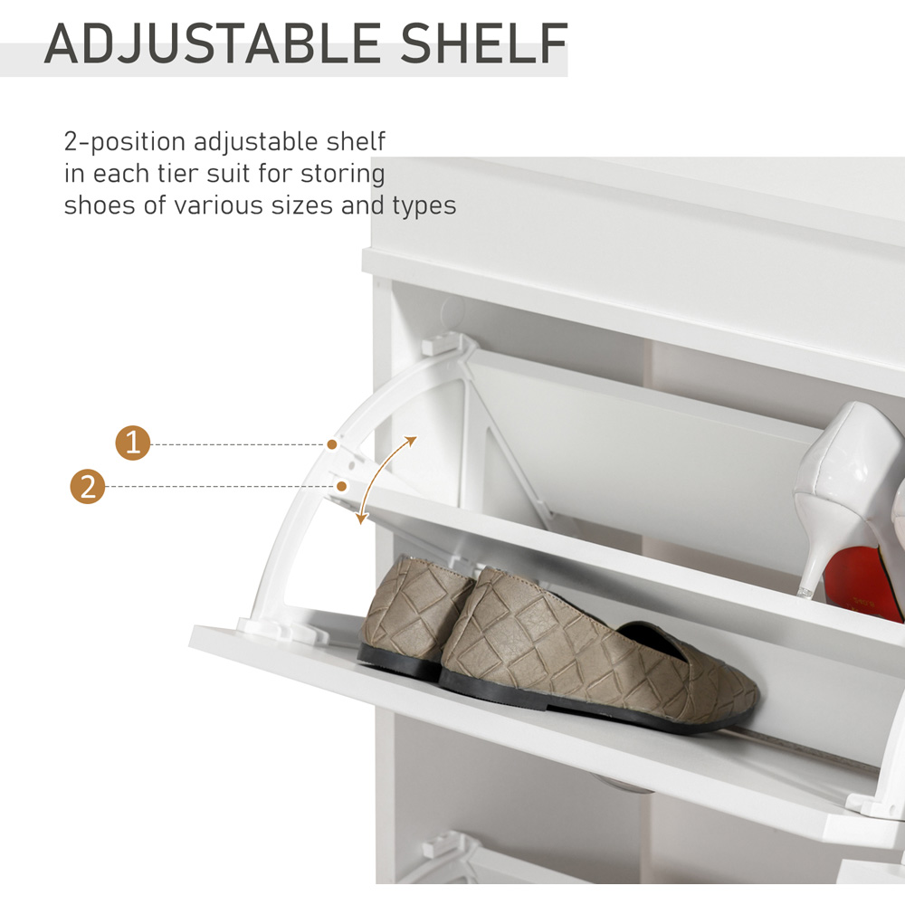Declutter your space with this Portland 4-Drawer White Narrow Shoe Cabinet. This stylish and modern cabinet makes a perfect fit for any decor space. Designed practically, the unit comes with an adjustable board in each tier providing efficient space. Ensuring safety, the anti-toppling design at the back of the shoe cabinet prevents the cabinet from falling or tipping over. Moreover, it is simply perfect to keep your shoes and accessories neatly tucked away. This cabinet holds 32 pairs of shoes (maximum UK size 8). Sturdy and long-lasting, the unit is crafted using a particleboard frame and MDF drawer panel with a blister treatment for superior strength and easy maintenance.