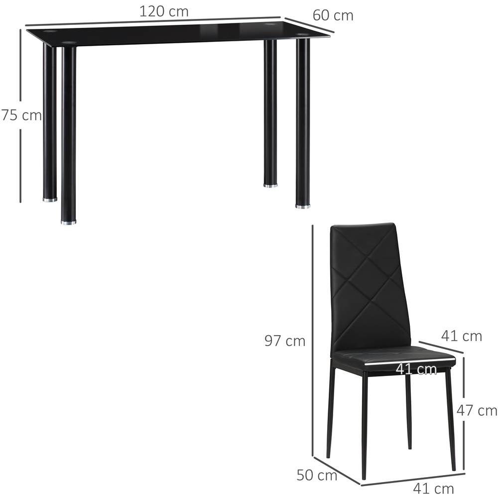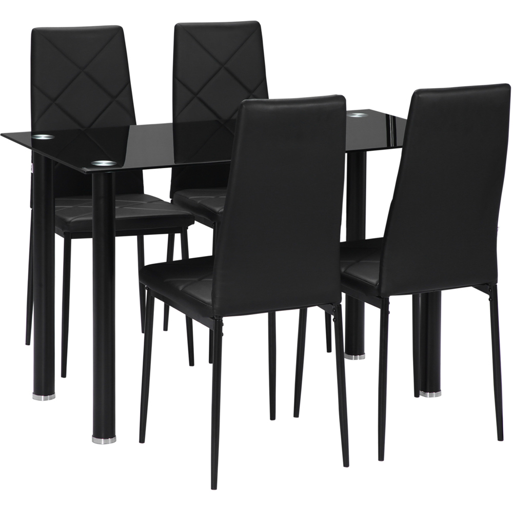 Transform any space into a comfortable gathering spot with this Portland 4 Seater Dining Set Black. Perfect for smaller areas, it includes a table and four matching chairs that can be easily tucked away to save space. The glass tabletop adds a touch of elegance and provides a durable surface that can be effortlessly wiped clean. The chairs are designed with comfort in mind, featuring thick padding and a sleek faux leather finish. This set is both stylish and practical, making it a great addition to any home.