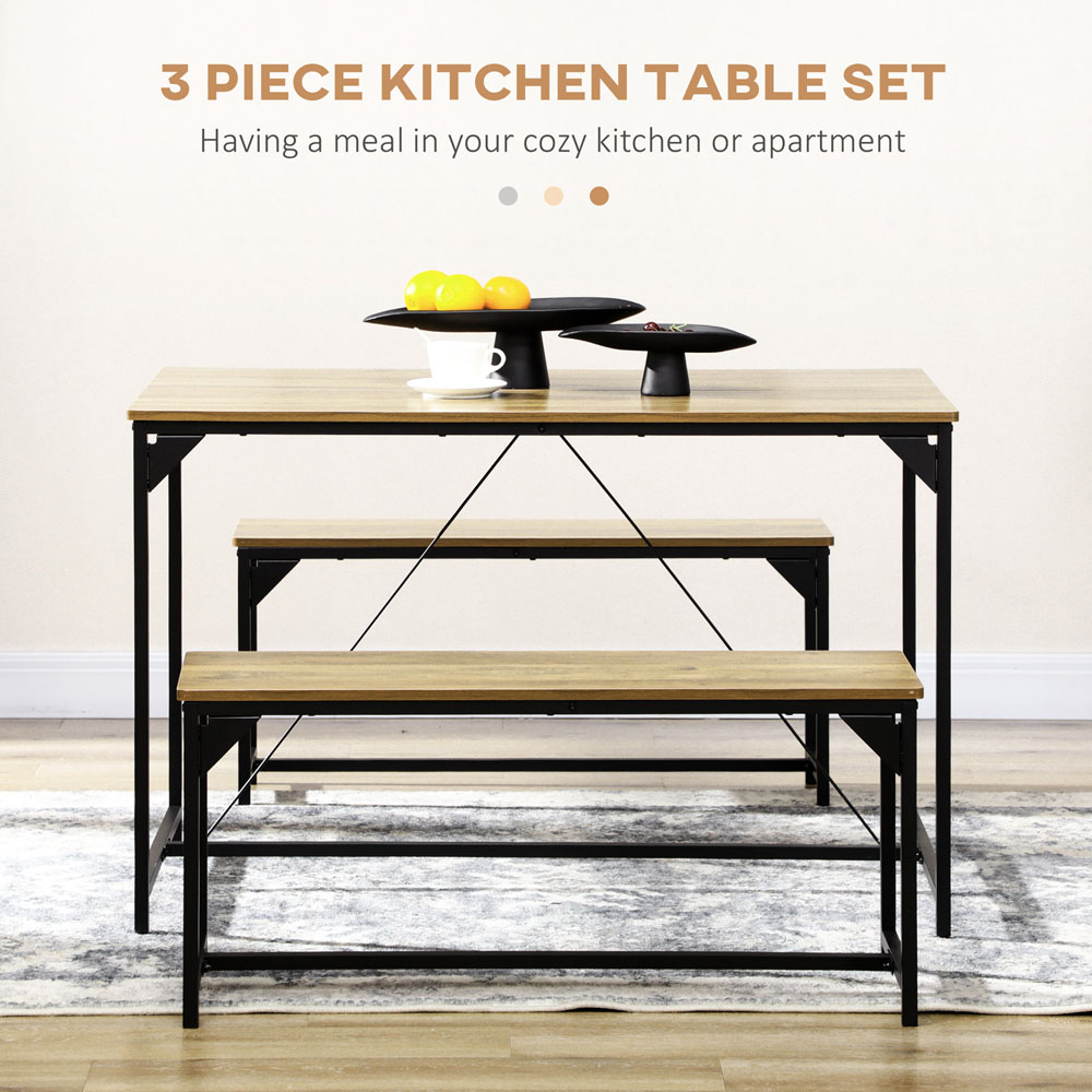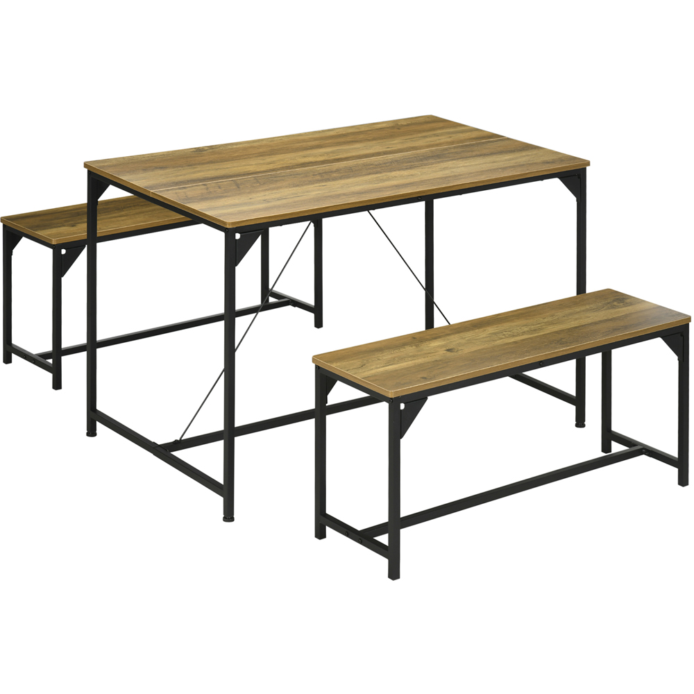 Dine in style with the Portland Natural Wooden Dining Table with Benches. This stylish four-piece dining set is designed for four individuals - perfect for bringing the family together. Featuring an industrial design with black frames and a wood effect table and bench tops, it makes a fashionable addition to homes. Also, compact, the armless benches can be easily tucked under the table for saving space. Size: Table: 75 x 120 x 70cm. Bench: 45 x 100 x 30cm.