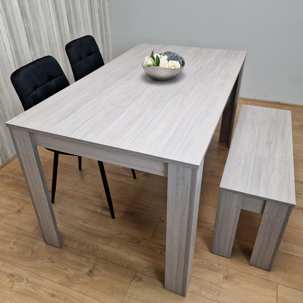 Complete your dining room setup in style with this Portland 4 Seater Square Velvet Dining Table Set. A combination of natural and modern styles, the set includes a table, two chairs and a two-seater bench. The dinner table and bench are crafted with high-quality MDF, and a melamine laminated finish in arrow grey to ensure a durable, long-lasting use. The set also includes two tufted velvet black Rocco chairs with a slightly curved back design for a contrasting look. Additionally, the legs are provided with adjustable foot protection to prevent damage. Supported by clear instructions, it's easy to assemble too! Dimensions: Table- H75 x W77 x L117cm. Bench- H45 x W30 x L90cm. Seat height- 45cm.