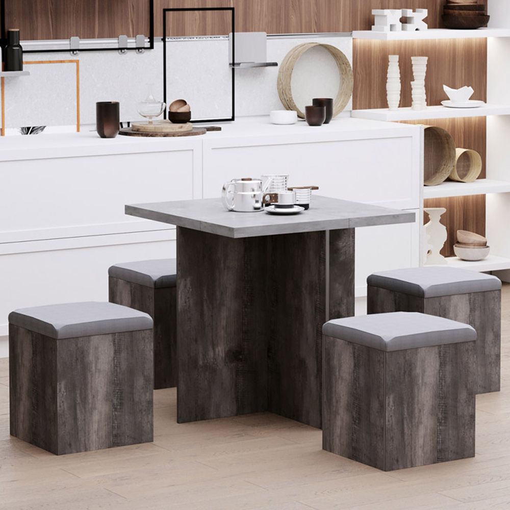 Transform your interiors with the Portland Grey Wooden Dining Set. This functional set includes a square dining table and four dining ottoman stools. Perfect for creating a cosy dining space, this table is ideal for a small family and is space-saving. Its armless stools offer free movement for an unrestricted seating experience and can be neatly placed under the table when not in use. Plus, it comes with removable lids that reveal hidden storage compartments for organising books, toys, blankets and more. Size: 76 x 78 x 78cm.