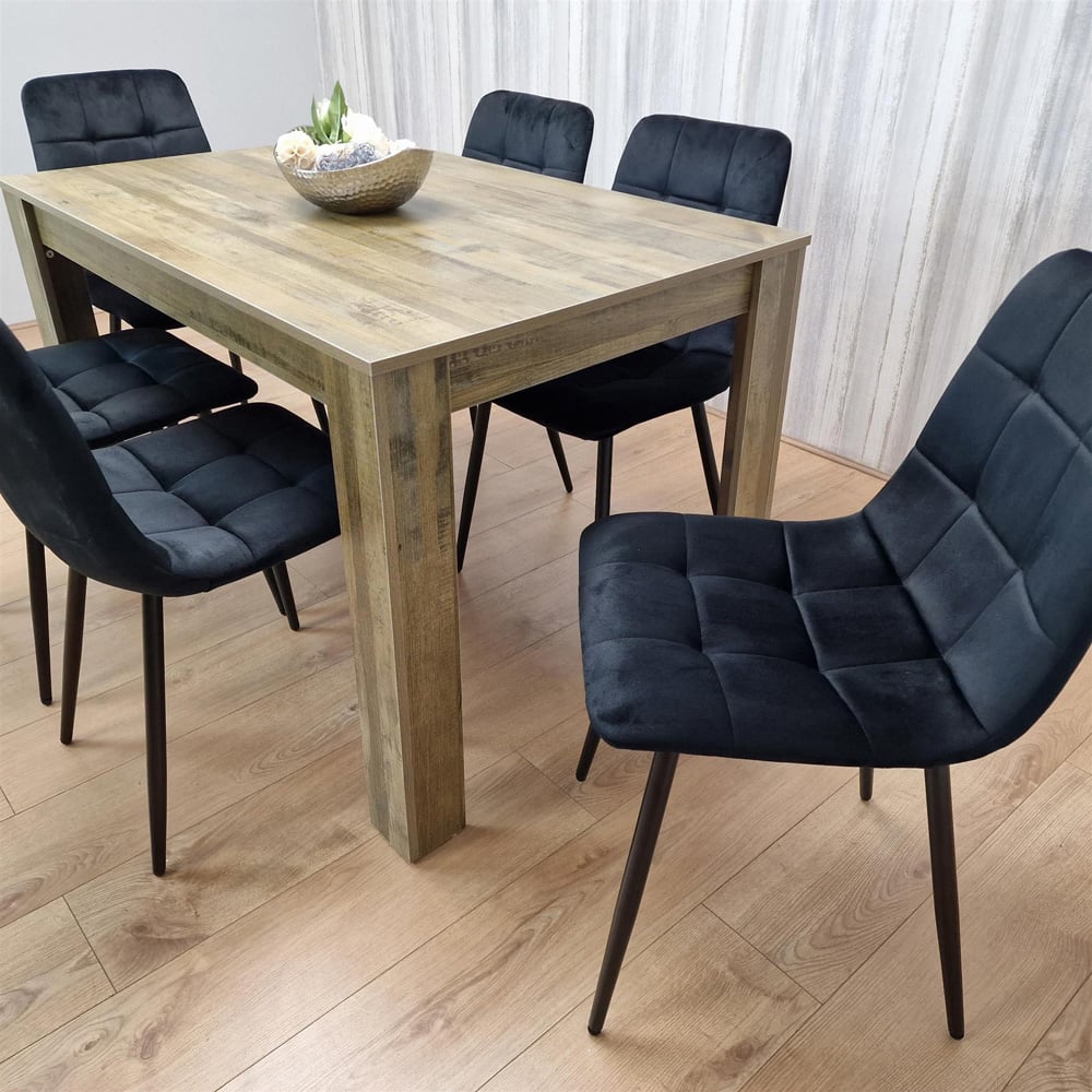 Update your home's look with the Portland 6 Seater Leather Dining Set Rustic Effect and Black. The table in this set is crafted using MDF and wears a melamine laminated finish to create a durable and long-lasting tabletop. It flaunts a wooden brown rustic effect look and is sure to add a touch of charm to your space. Stylish yet comfortable, the six chairs are designed with a slightly curved back to fit with body shape and offer comfort. They're covered in faux leather and stand on metal chair legs with adjustable foot protection to prevent damage. Plus, this set offers straightforward assembly to allow you to style it easily and elevate your home's style effortlessly.