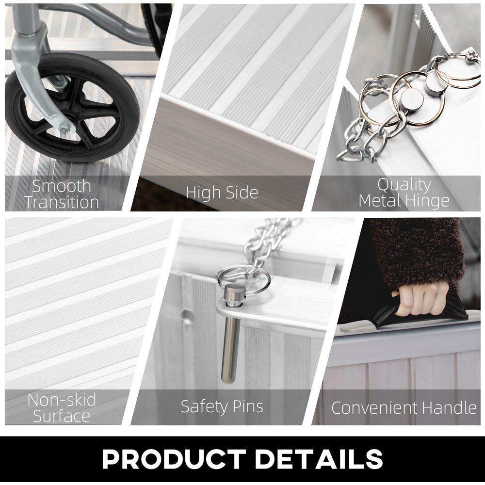 Get easy access to raised surfaces with this Portland Aluminium Foldable Wheelchair Ramp. This ramp is covered with a skidproof surface to prevent slipping, making it ideal for weather conditions. When not used, the ramp can be easily folded, saving space and enabling storage in the vehicle or home. The durable aluminium frame is anti-corrosive and can last for years of usage. This door ramp can be used with wheelchairs, lawn mowers, scooters, or any other heavy item that may cause trouble with stairs.