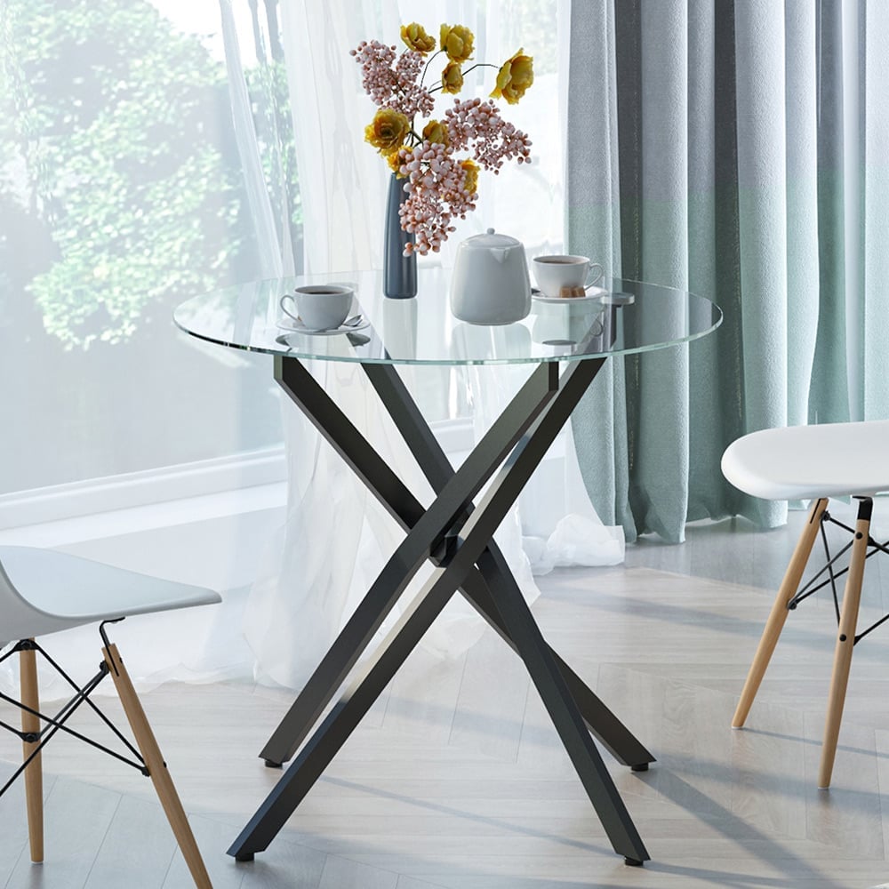 Make a modern addition to your home with this Portland Black Clear Tempered Glass Side Table. Featuring four legs crossed over with a clear tempered glass table top - it is perfect for your living room, lounge and office or study areas. With a metal frame and tough base - it provides full support. The side table comes with adjustable foot pads to keep table balanced, while protecting your floor.