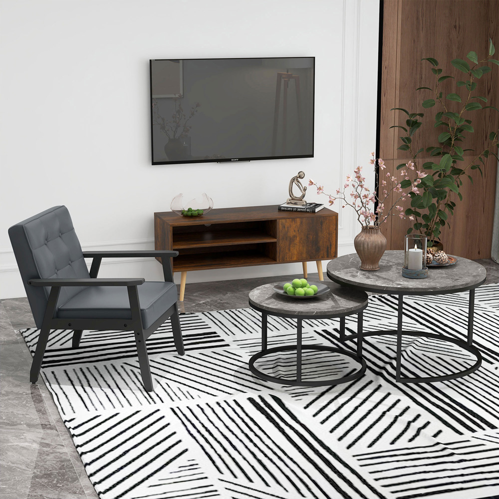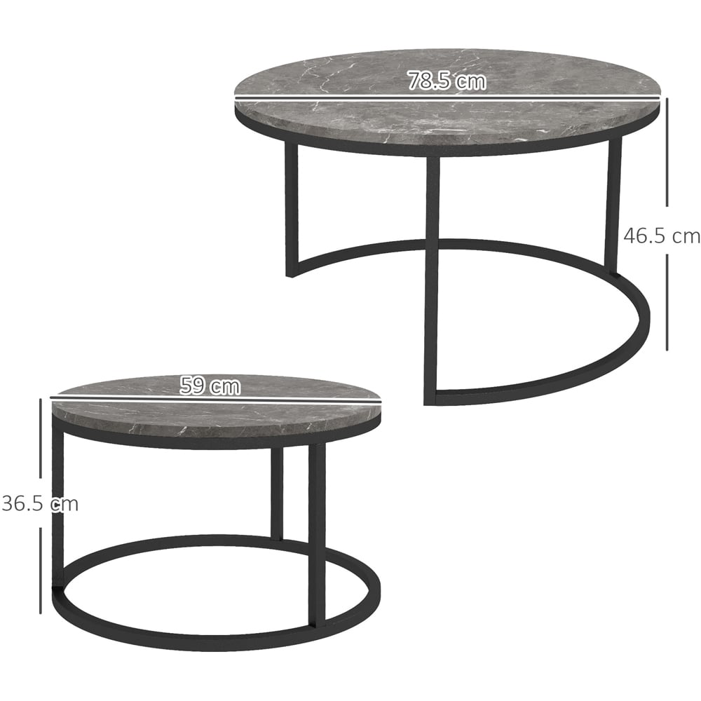 Add style and practicality to your space with the Portland Black Marble Effect Nest of Tables Set of 2. Featuring a stacking design, the set comes with a large and smaller table, allowing the smaller table to tuck underneath the larger one. Compact for storage, and easy to extend the holding and display space when required. Elegant and beautiful, the round table tops are finished in black marble and have contrasting black frames to beautify your space. Sturdy and solid, they are made from solid steel, and MDF topped for durability. Also, the foot pads ensure extra balance whilst protecting your floor from marks and scratches—Set of 2.