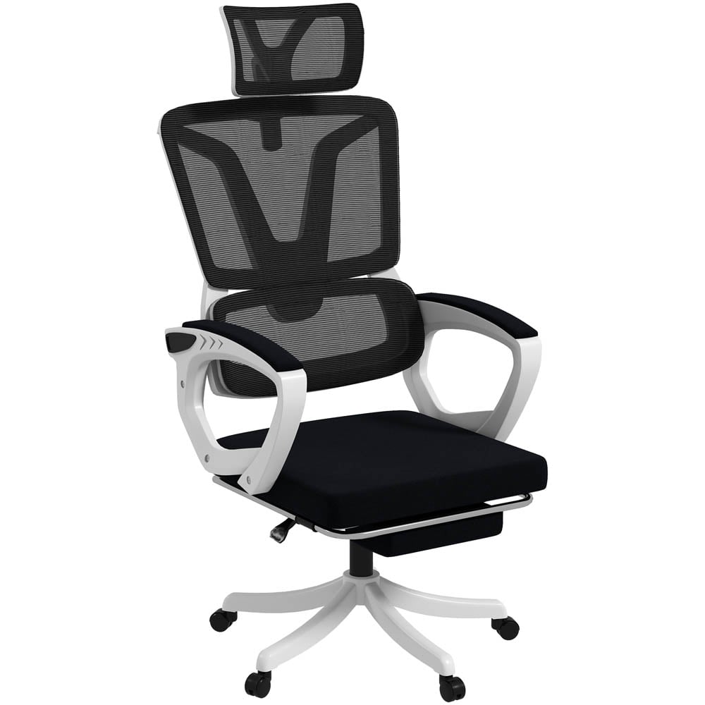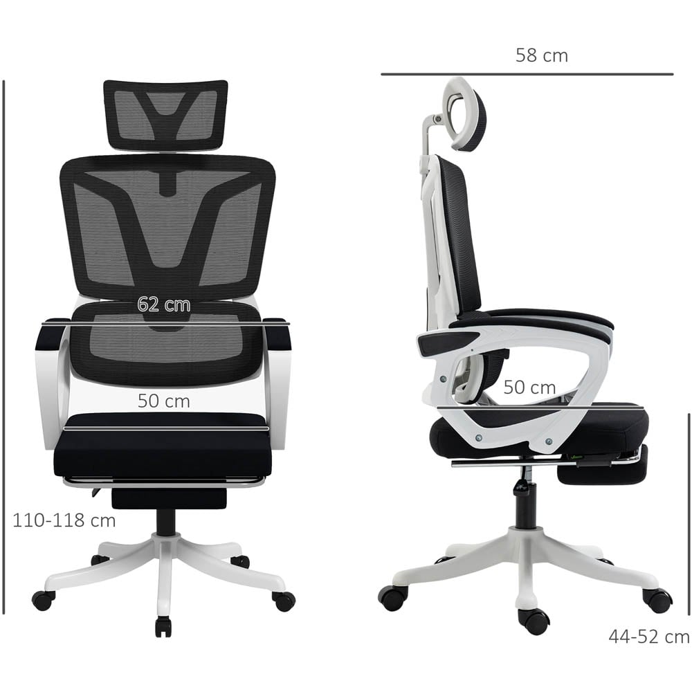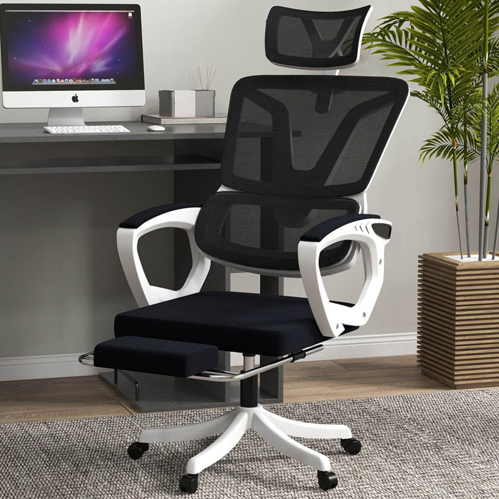 Start your journey to comfort and efficiency with the Portland Black Mesh Recliner Office Desk Chair with Footrest. This chair features a 100°/115°/130° reclining back with a footrest, allowing you to lean back and elevate your body whenever you want. The chair's fully moving seat works with your body's motions, ensuring maximum comfort all day long. It also has thick padding and linen-look upholstery for added comfort. You can adjust the chair's height from 110cm to 118cm, making it perfect for use with different desk levels. Plus, the chair also has an adjustable headrest, lumbar support, and swivel wheels, making it a great choice for anyone looking for a versatile and comfortable office chair.