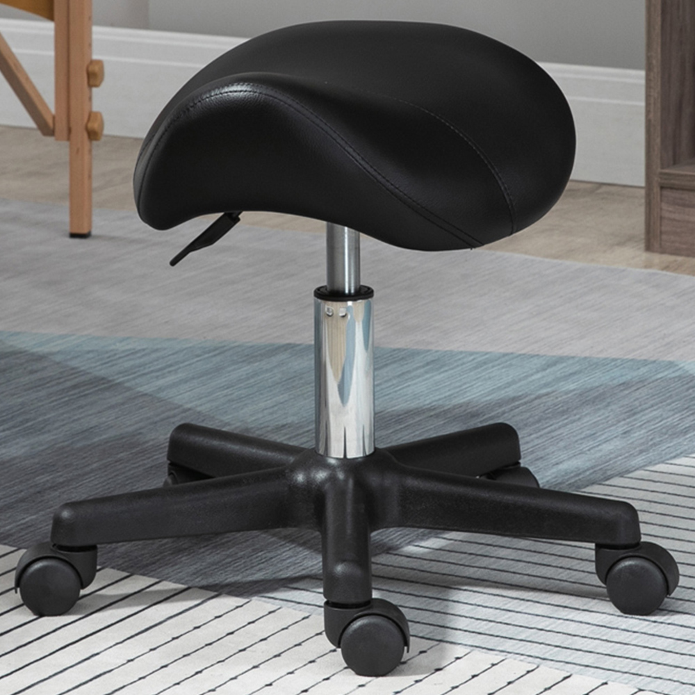 Relax in this stylish Portland Black PU Leather Height Adjustable Swivel Saddle Stool. This saddle stool features a steel base for balance and weight. The height of this stool is adjustable between 45cm and 57cm, so you can sit in any position you want. Curved in shape, the padded seat is wrapped in sleek PU leather, allowing you to sit comfortably while keeping you supported, and has five wheels to move around quickly when seated. Also, this beauty stool can be used for hairdressers, beauty salons, tattoo parlours, or even for your home.