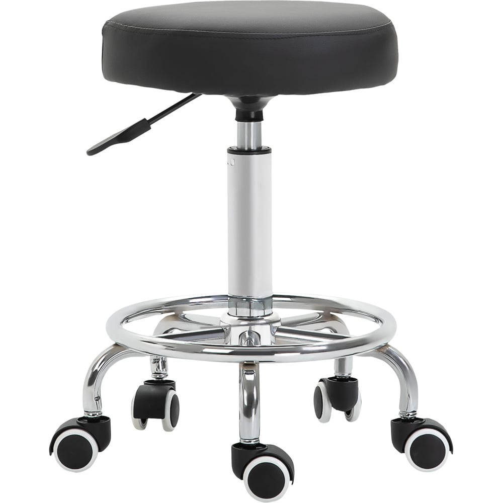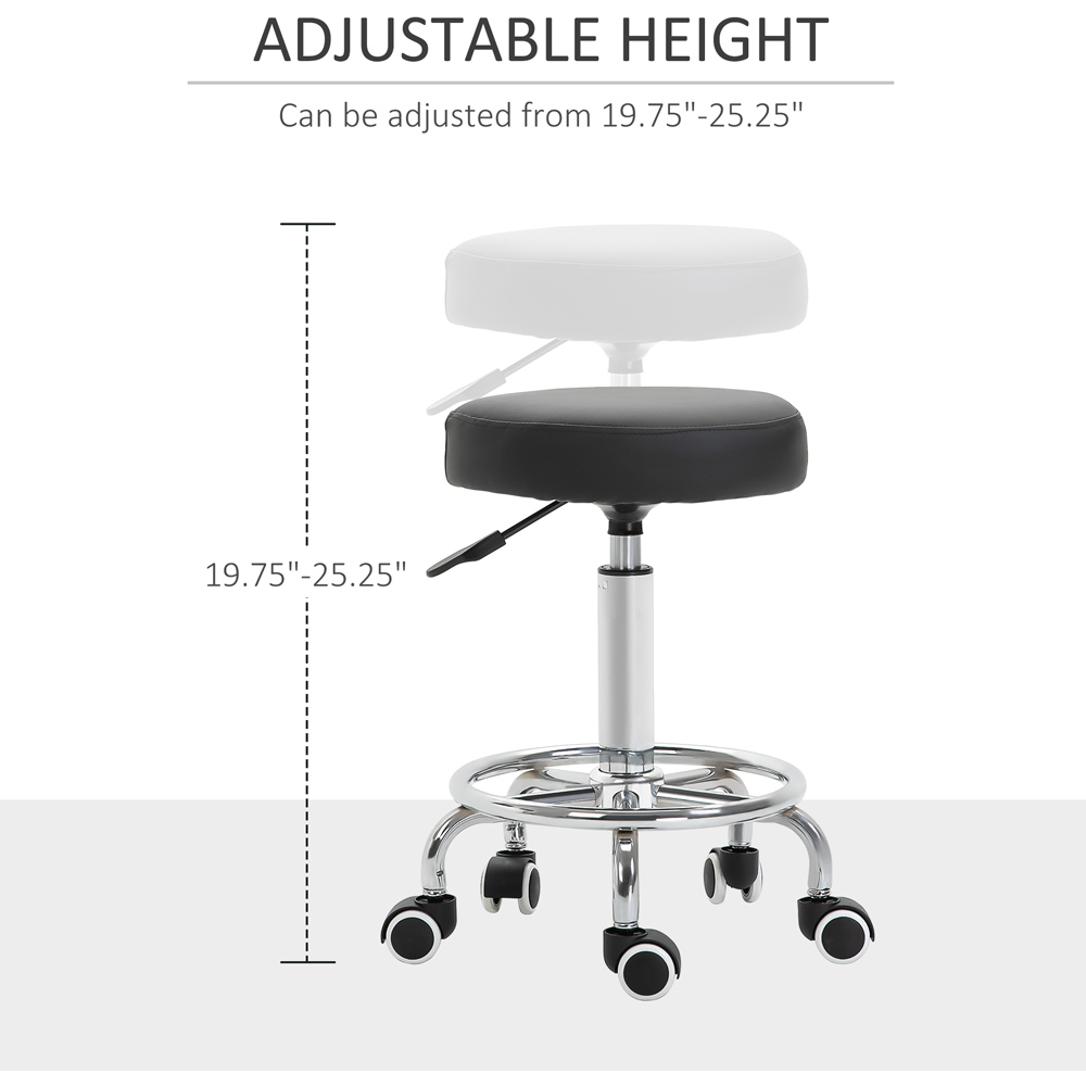 Relax in this stylish Portland Black PU Leather Height Adjustable Swivel Stool. This swivel stool provides maximum comfort and freedom as you work, whether as a hairdresser, dentist, beautician, etc. The stool uses a steel frame for a solid structure. You can set it to different heights from 50cm to 64cm, powered by the under-seat lever. It is fitted with a large round padded seat for comfort and is filled with thick foam and PU leather, which can be wiped clean. There are five castor wheels for easy movement and a footrest for extra comfort - an easy way to move quickly around clients and perfect for haircuts or treatment.