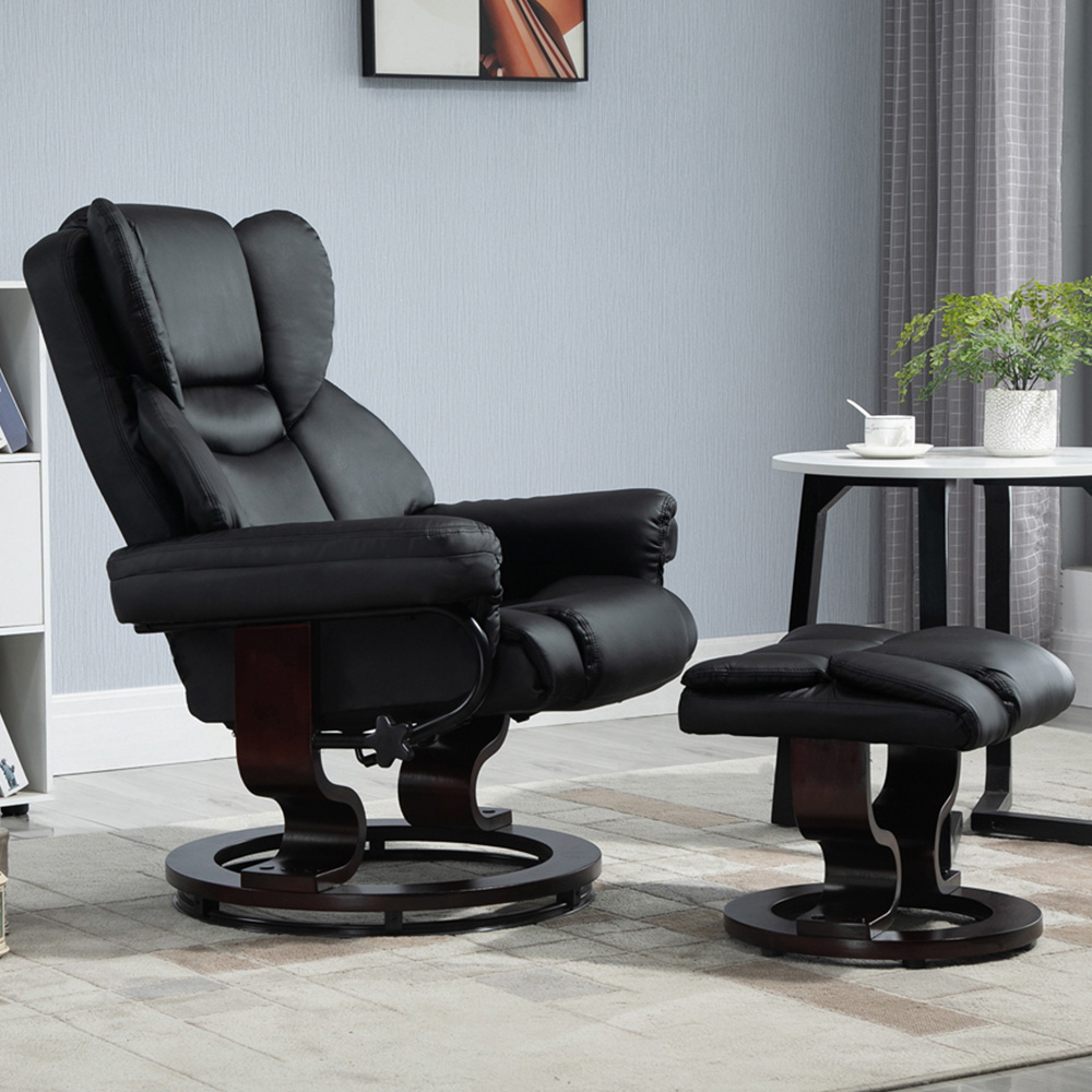Welcome superior comfort into your humble abode with this Portland Black PU Leather Manual Recliner Chair with Footstool. Sturdy and comfortable, this swivel chair has a metal frame to ensure strength and features a wide seat design with thick padding and faux leather upholstery for a modern look. Manually pushing back to a 145° angle, this swivel recliner chair makes an ideal spot for resting. Moreover, it comes with a footstool for complete relaxation. For added comfort, the recliner chair comes with thick, all-over padding and curved armrests for you to sink in supreme comfort.