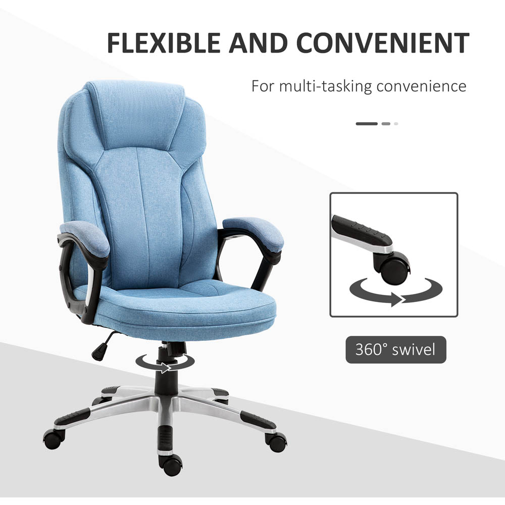 The Portland Linen Fabric Home Office Chair in blue is a versatile and comfortable option for your workspace. With an adjustable height range of 45 to 56cm, you can easily adjust the chair to your desired position, accommodating different table levels and body types. The ergonomic design features a large seat, high back, and fixed armrests, providing proper support and posture as you work. The chair also comes with a padded headrest for additional comfort and support. The linen-look upholstery is smooth on the skin and adds a touch of elegance to any home office. Whether you're using it for work or leisure, this comfy chair is a great addition to your space.