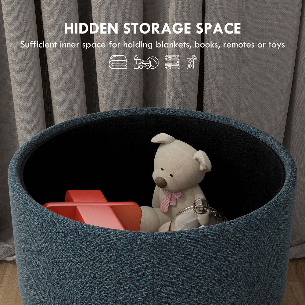 If you need some extra storage but also want to add an accent piece to your home, this Portland Blue Round Linen Ottoman Footstool is a great fit. Storage under the seat is great for smaller items and furnishings, helping to keep your space tidy. The Ottoman stool has room for blankets, books or remote controls that need to be put away. Wooden legs offer plenty of support, and the cushioned top keeps you comfortable with a smooth linen look. Whether as a round footstool in the living room, a shoe-changing stool in the entryway or a dressing stool in the bedroom, this storage stool is suitable for various settings.