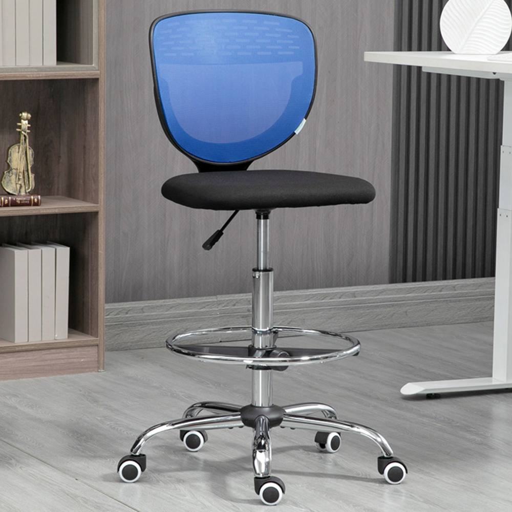 The Portland Dark Blue Swivel Office Draughtsman Chair is a high chair designed specifically for working on higher surfaces and levels. With an adjustable height range of 68 to 88cm, it provides flexibility and convenience. This chair is not only functional but also comfortable and supportive, thanks to its padded seat that allows for longer periods of sitting. The back panel helps maintain proper posture, and the mesh covering ensures breathability. Additionally, the chair features a 21 to 49cm adjustable foot ring, which allows you to rest your lower body while working.