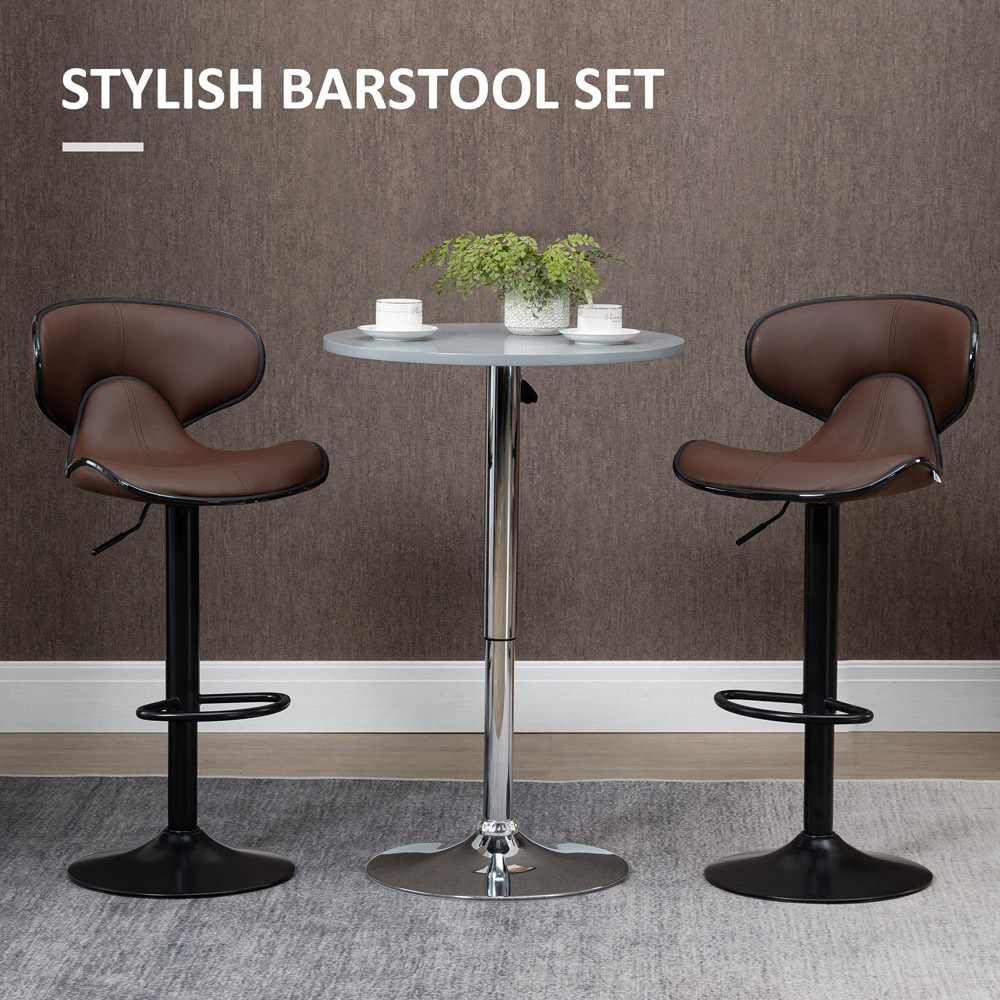Elevate your bar area with the Portland Brown Faux Leather Height Adjustable Swivel Bar Stool Set of 2. Crafted with cured faux leather seats and a plush padding, these stools are comfortable and modern-looking. They have a unique winged shape supported by a sturdy steel base that ensures stability and durability. With an adjustable height ranging from 89.5cm to 109.5cm, they effortlessly complement different countertop heights. The provided footrests are convenient and functional.