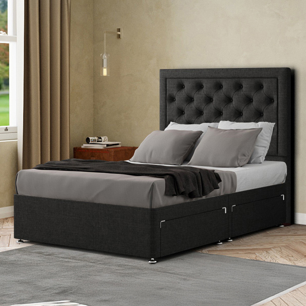 Introducing the Castle Divan Bed - Elevate Your Bedroom with British Craftsmanship! The Castle Divan Bed embodies the essence of British craftsmanship, meticulously designed and built for enduring quality. Elevate your bedroom with its floor-standing 54-inch headboard adorned with matching buttons, radiating sophistication and adding a touch of luxury to your space. Mattress Not Included. Designed to pair seamlessly with your preferred mattress, the Castle Divan Bed allows you to create a personalised sleep sanctuary. Crafted with top-tier materials, this divan bed ensures durability and comfort, promising years of restful nights. Elevate your bedroom with the Castle Divan Bed and experience the perfect fusion of style, functionality, and quality. Transform your space into a haven of comfort and sophistication—order yours today!