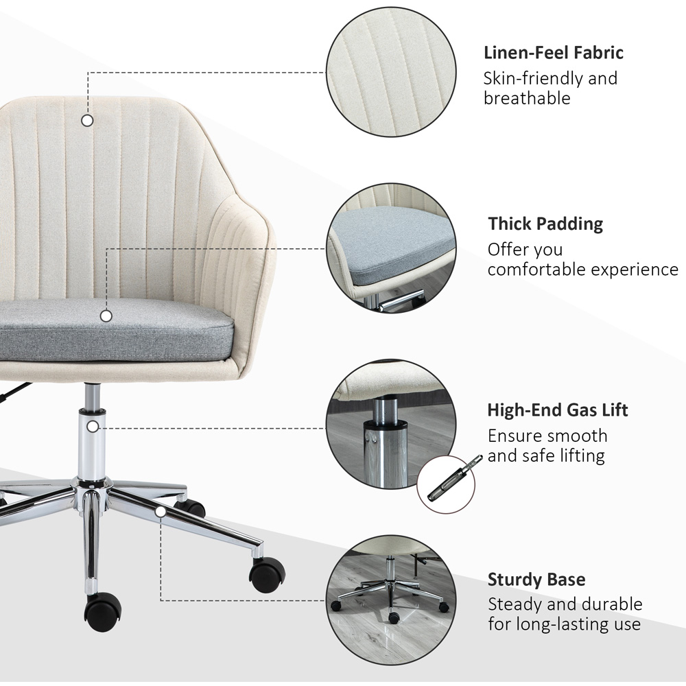The Portland Beige Linen Fabric Office Chair offers ergonomic features such as a wide seat, high back, and adjustable height, allowing you to work comfortably. It also has a swivel seat and removable cushion for extra comfort. The chair is covered with smooth and soft fabric, giving it a linen-look upholstery, and features line stitching on the back for added style.