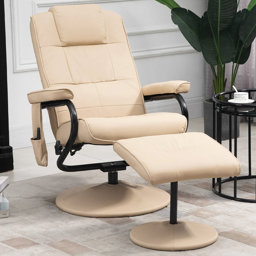 Relax and melt the aches and pains away after a long day with the Portland Cream PU Leather Massage Manual Recliner Chair with Ottoman. This two-piece set comes with a massage recliner chair and matching ottoman footstool - all you need for relaxing and resting your feet up any time of day. Both are padded for comfort, with PU leather upholstery for a sleek look. The chair reclines back to a maximum 145° angle, controlled by the manual side knob. It features ten vibrating points (controlled by the included remote) to give you the full experience with sitting, lying and 360° rotating. With points located in the neck, back, thigh and legs, this swivel armchair can relax your body at all different points.