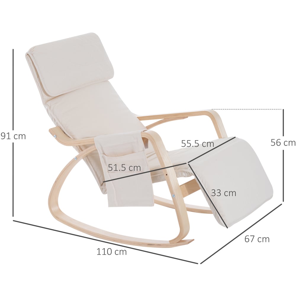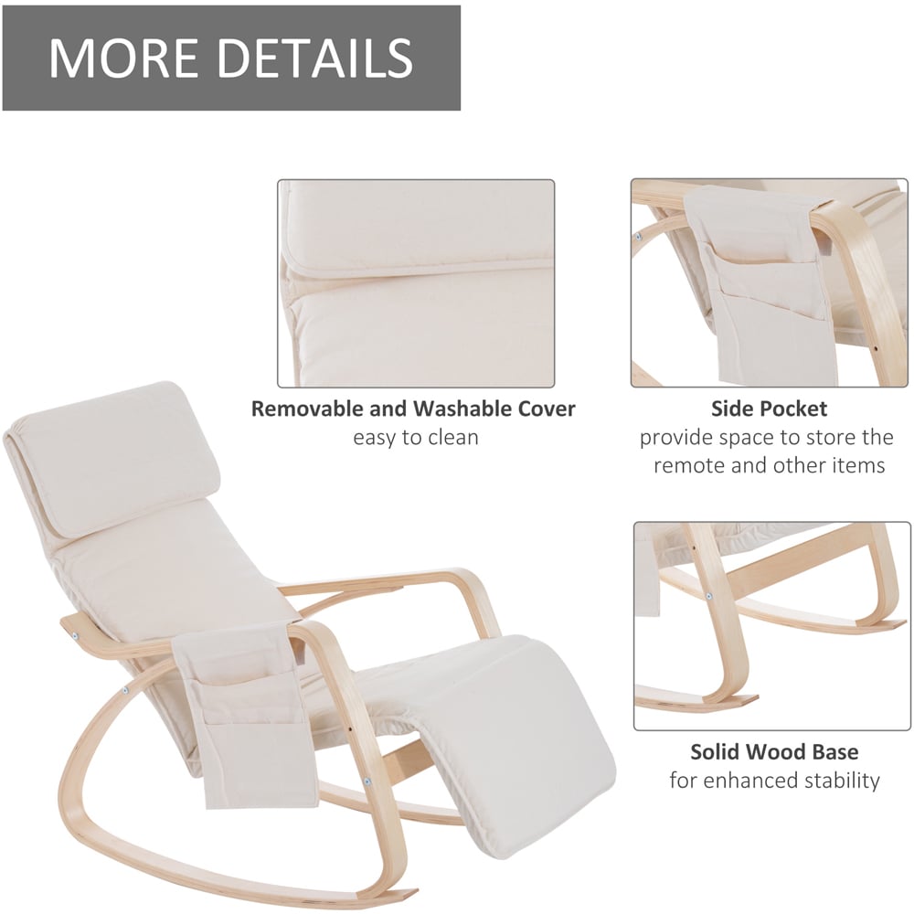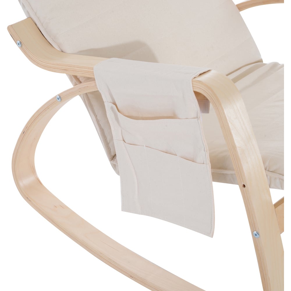 Designed with comfort and style in mind, this Portland Cream White Rocking Lounge Chair is crafted from birch wood for a strong structure and features a gently curved shape, which allows it to rock forward and backward. The padded seat and headrest offer added comfort. Its five-level adjustable leg rest allows you to set to a position you like to relax and unwind. While the side pockets help keep items you need close by, offering you a blend of comfort and functionality.