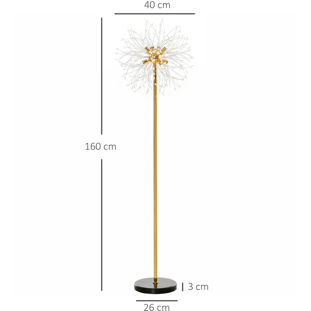Decorated your home with this Portland Dandelion Tall Floor Lamp. This lamp features shining branches with plenty of crystal beads, like a massive sparkly dandelion or firework, when it emits warm, bright light to embellish your home. Using a solid metal frame with a gradient gold tone finish and its sturdy marble base gives the daylight lamp an elegant, balanced, and stable look. It is equipped with a foot switch for easy operation and requires eight G9 bulbs (not included). Please click here to find our range of lightbulbs.