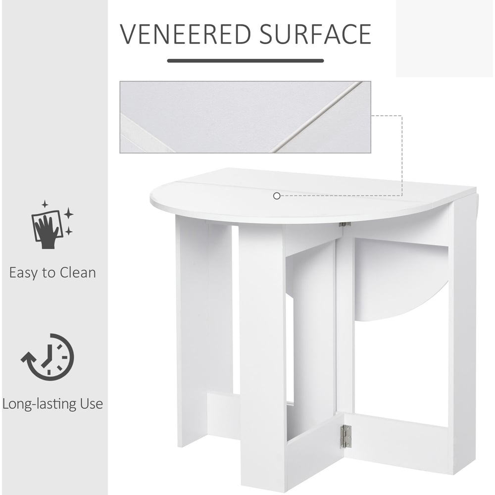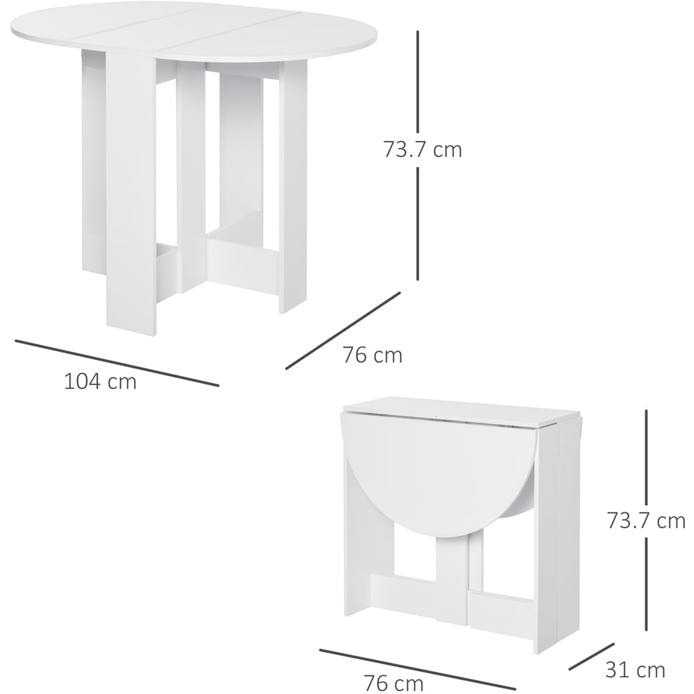 Elevate your dining space with the Portland White Leaf Drop Folding Dining Table. Featuring a drop-leaf design, this table is perfect for small apartments or homes. Also, it boasts two drop leaves, which can be half or fully folded to suit your dining needs. Versatile and practical, the table can serve as a dinner table for dining rooms or be adjusted for activities like parties, homework, drawing, etc. Additionally, when folded, it conveniently transforms into a console table. Minimalistic and stylish, the table comes in a clean white finish to blend well in any space. When not in use, simply fold it up and store it away to save valuable floor space. Size: 73.7 x 104 x 76cm.